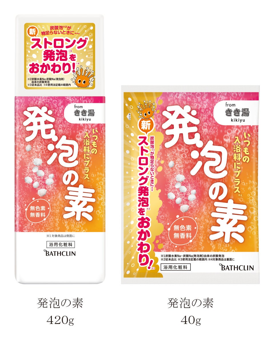 「発泡の素」は、いつものお風呂を手軽に炭酸泡*1のお風呂に変えて楽しむ新しい入浴スタイルを提案し、ご好評をいただいております。このたび発泡力をパワーアップ*2させて、8月22日(火曜日)にリニューアル発売いたします。炭酸泡*1が物足りないと感じた際に、手軽に追い炭酸泡*1.3.4をしていただけます。ご自宅のお風呂でぜひお楽しみください。