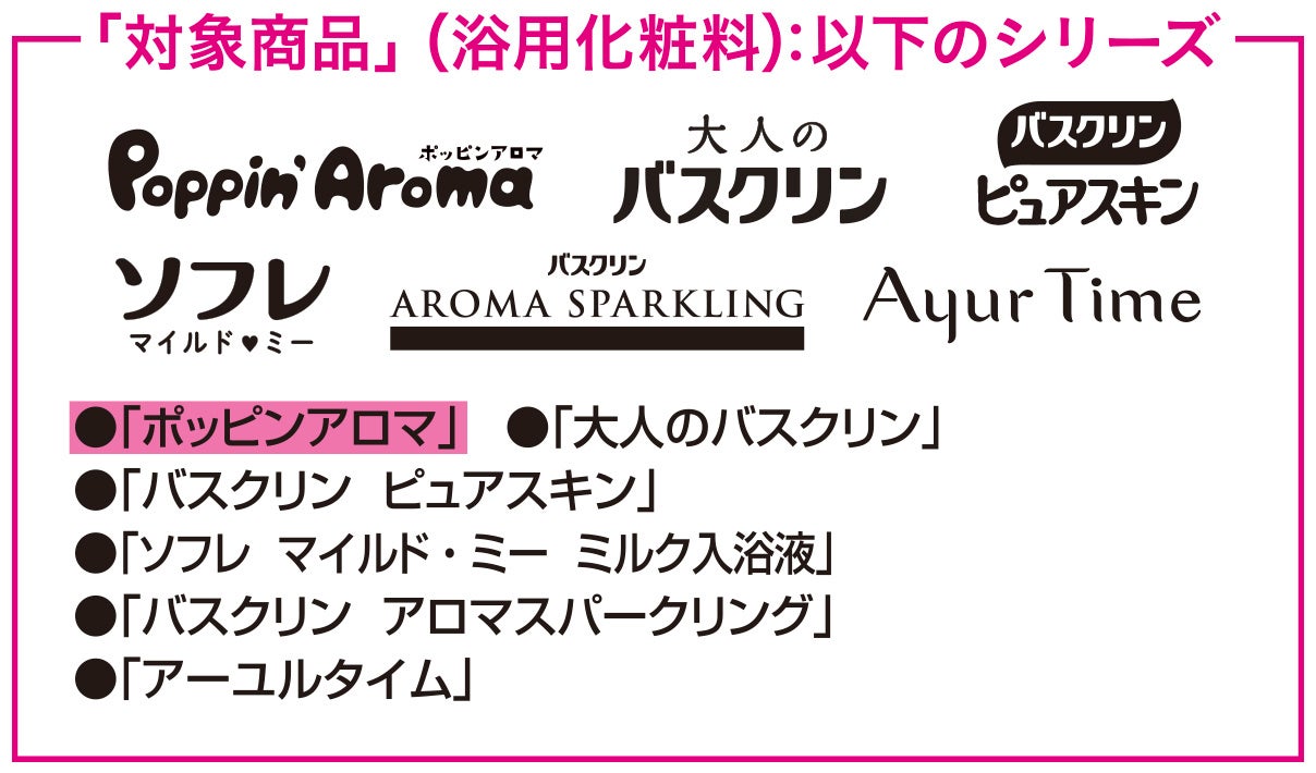 「対象商品」(浴用化粧料):「ポッピンアロマ」、「大人のバスクリン」、「バスクリン ピュアスキン」、「ソフレ マイルド・ミー ミルク入浴液」、「バスクリン アロマスパークリング」、「アーユルタイム」