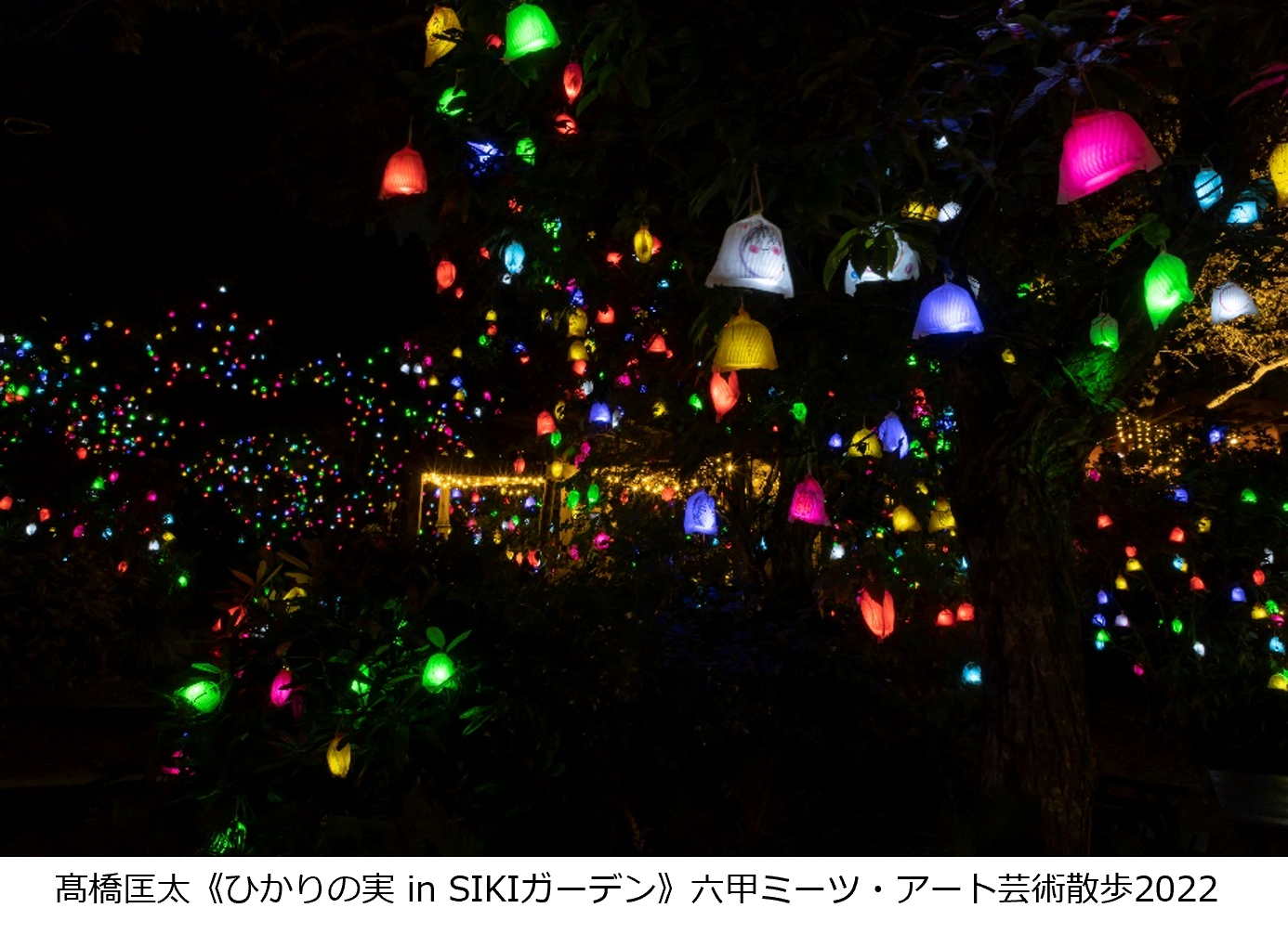 本作品は笑顔が描かれた果実袋の中に、LEDの小さな光を入れて木々に取り付け、あたたかな夜景を作り出します。今年は神戸市内の小中学生などが参加し約5,000の≪ひかりの実≫を会期を分けて2,500ずつ展示します。
