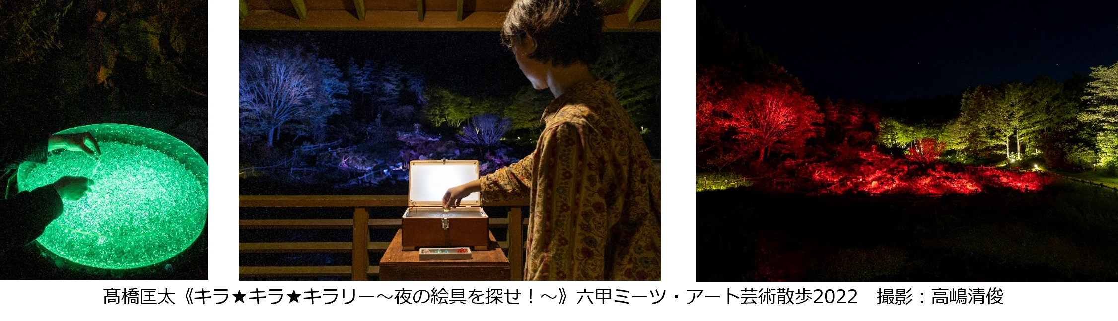ROKKO森の音ミュージアムと六甲高山植物園では、9月23日(土・祝)から11月23日(木・祝)までの土日祝日限定で夜間営業を行い、自然の中で夜間限定作品等を鑑賞できる「ひかりの森~夜の芸術散歩~」を開催します。光や映像を使った作品を展開しているアーティスト、高(※1)橋匡太による体験型アート作品や、「時間・記憶」などをテーマに作品を制作している赤坂有芽による映像作品を展示します。このほか、両施設のアート作品をライトアップして展示します。