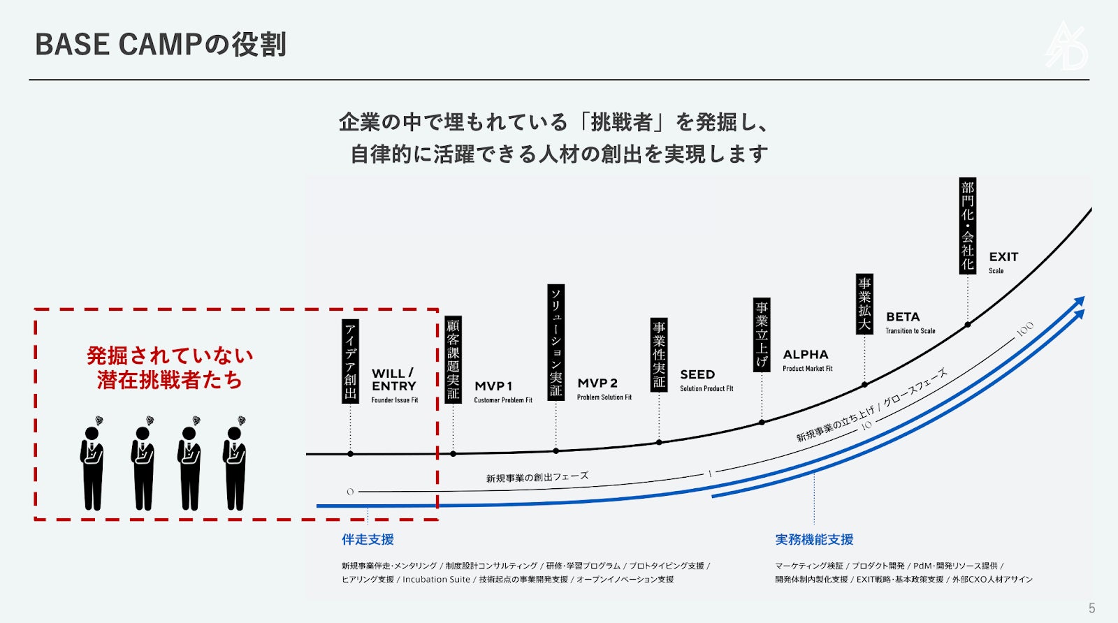 株式会社アルファドライブ(本社:東京都千代田区、代表取締役社長 兼 CEO 麻生要一、以下「AlphaDrive」)は、企業内の新規事業公募制度への挑戦人材の母集団を増やすためのコミュニティ支援策として、「AlphaDrive BASECAMP」のサービス提供を開始したことをお知らせいたします。