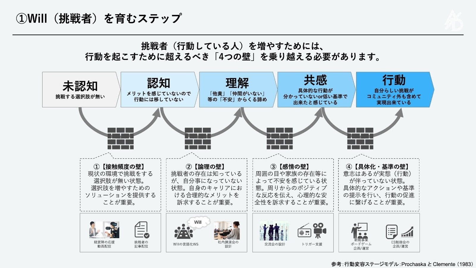 「壁」を分解してみると、「未認知の壁」、「認知の壁」、「理解の壁」、「共感の壁」を超えて初めて「行動」の起点が生まれることを発見しました。そのために必要な心の準備や事前スキルなどを養える場として、この度「AlphaDrive BASECAMP」の支援を開始いたしました。