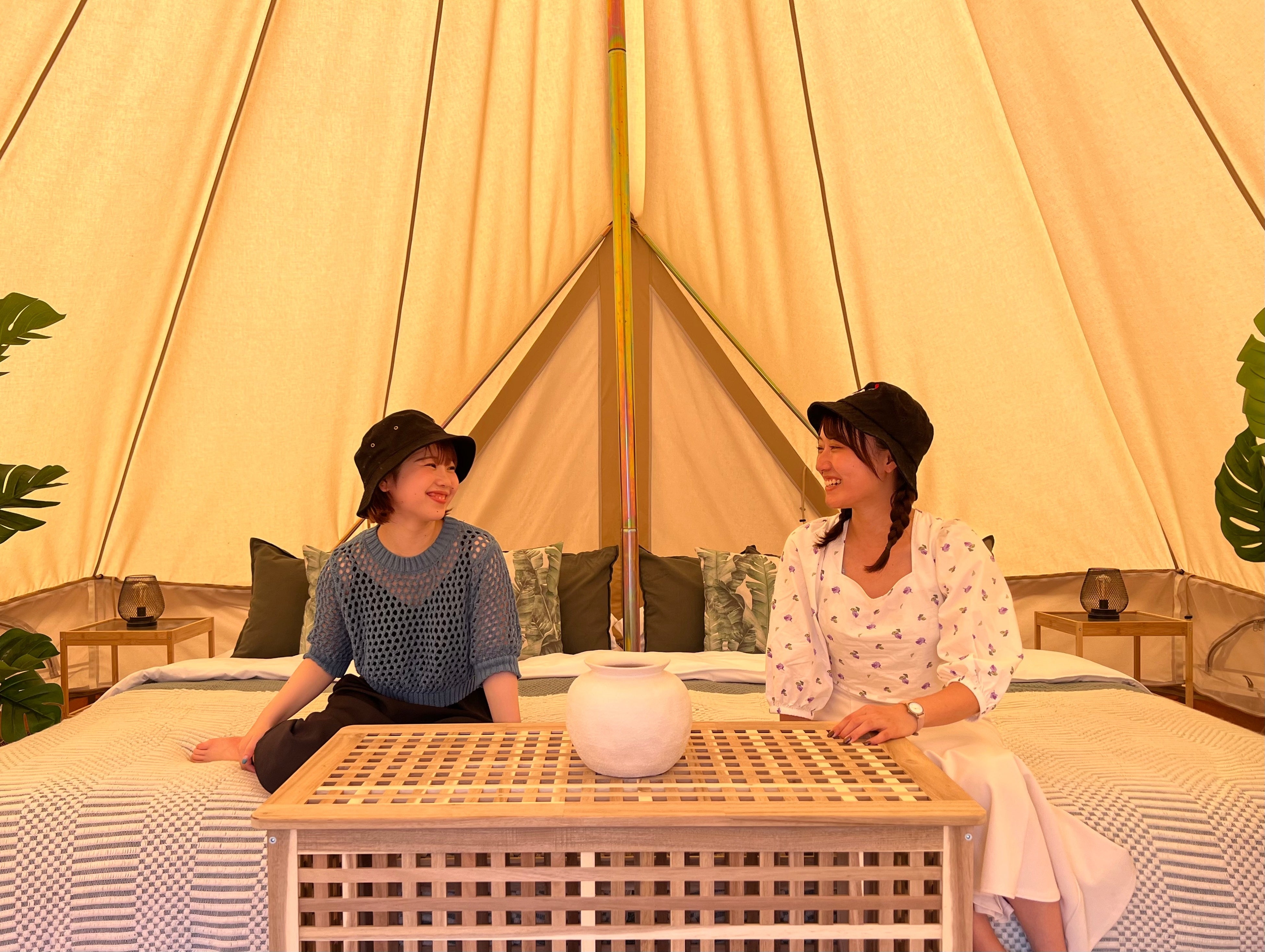 コンセプトの「森の中のオアシス」の名の通り、テント内でもみどりを感じられる内装で統一しており、大変好評をいただいております。
