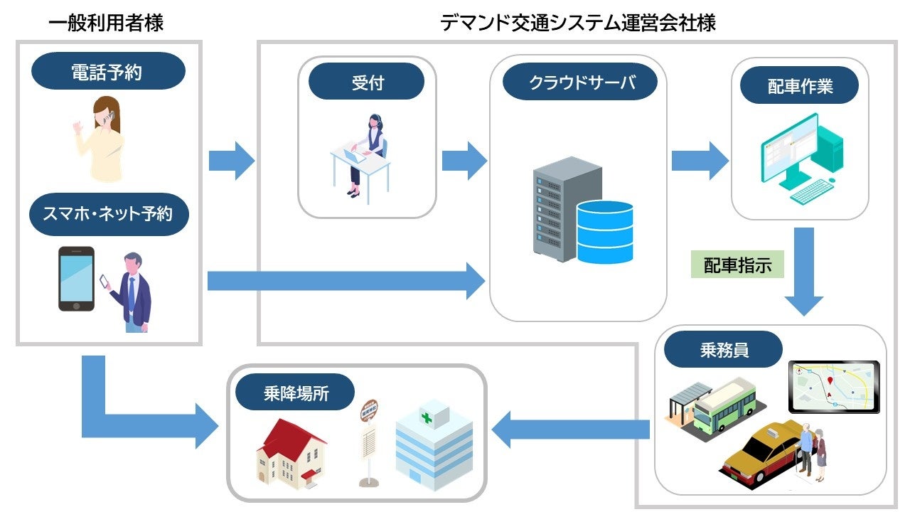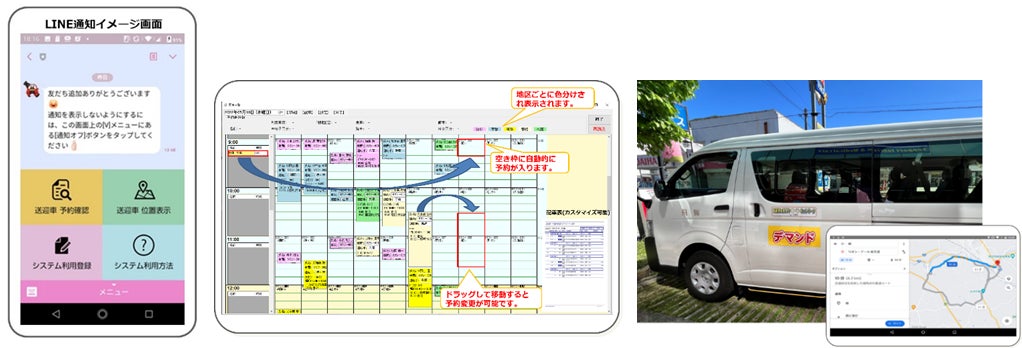 このたび納入した、「デマンド交通システム」は、予約の受付から運行計画の作成・配車指示など、デマンド交通の運営における業務を効率化するシステムです。予約電話の着信時に、予め登録された利用者情報を自動的に画面表示する「CTI機能」、直感的な操作で運行計画の作成や配車指示を行う「運行計画作成・配車指示機能」、車載のタブレット端末で目的地までのルートを表示し、ナビゲーションを行う「ドライバー支援機能」など、快適で安定した運行をサポートします。また、利用者においてはスマートフォンのLINEアプリで予約や車両の現在地確認ができるなど、利便性向上にも貢献します。