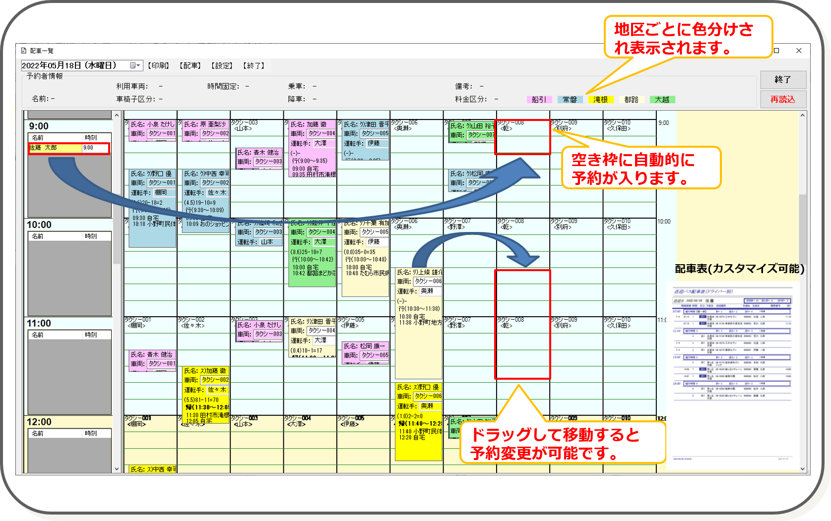 例えば、車両や予約時刻の変更は、画面上でドラッグ&ドロップするだけで完了します。