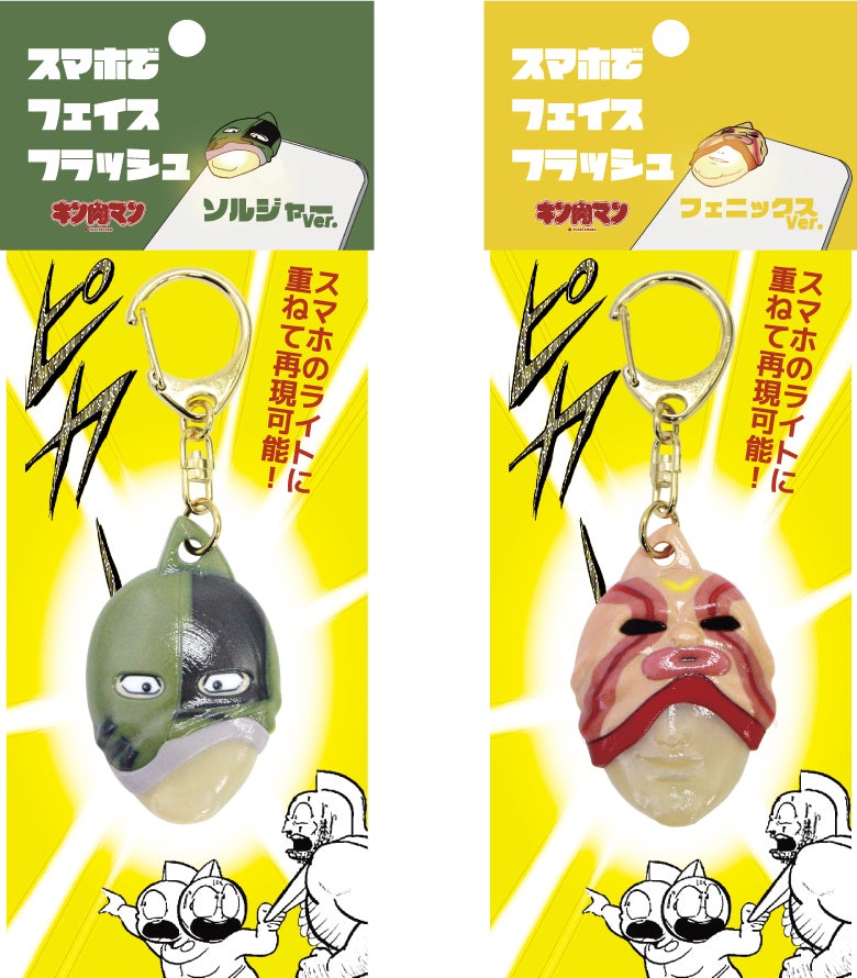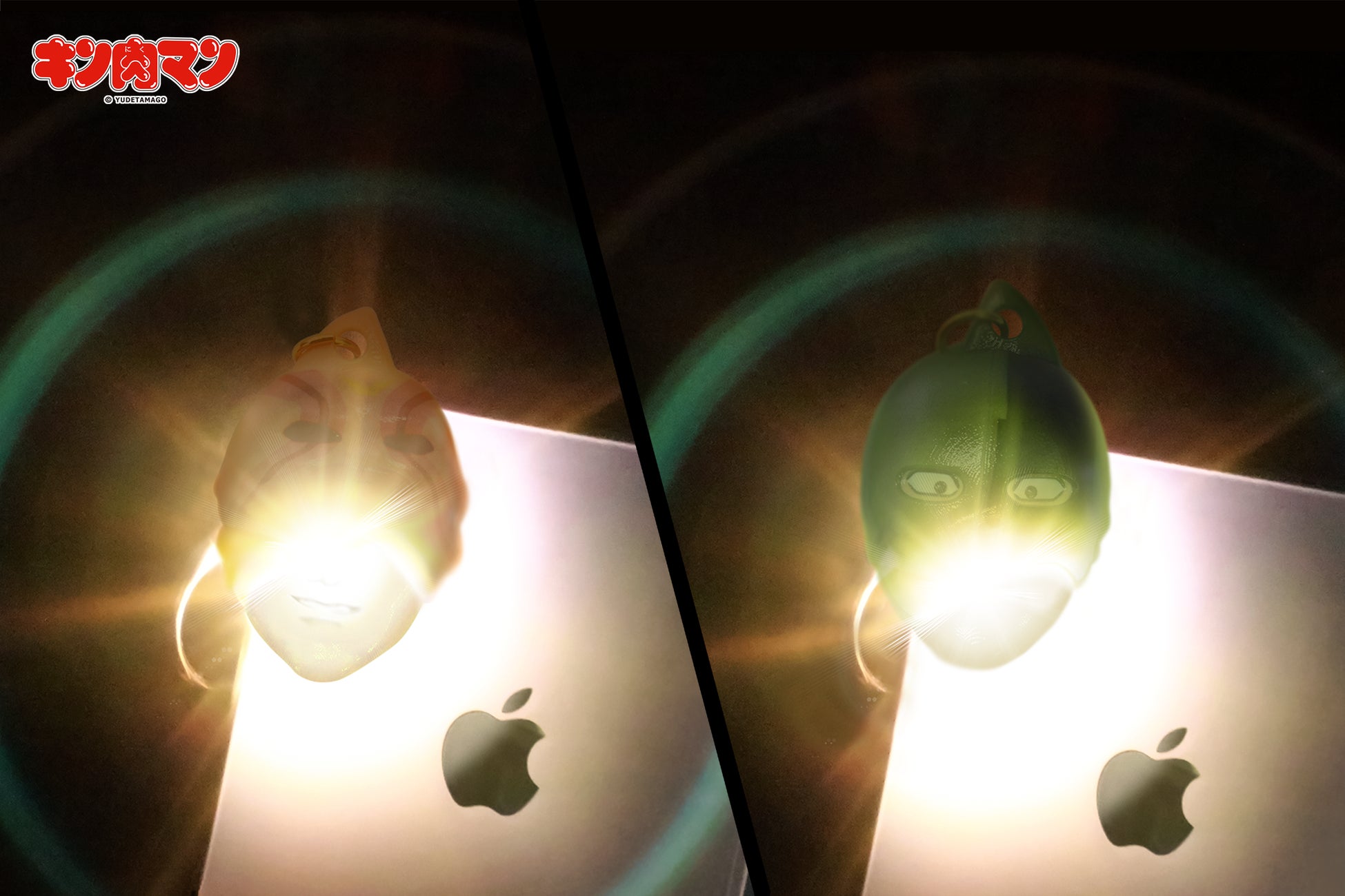 スマホのライトに顔部分をかざすことで、漫画「キン肉マン」のキン肉王族の一部しか使えない技「フェイス・フラッシュ」が、誰でも簡単に再現できるアイテムとなります。