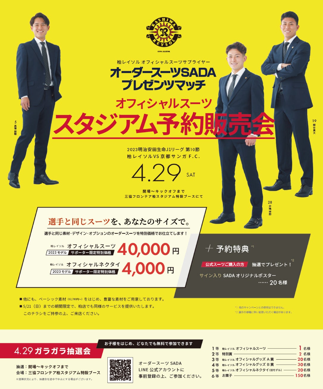 「柏レイソル」 オフィシャルスーツサプライヤー オーダースーツSADAプレゼンツマッチオフィシャルスーツ予約販売会 4月29日(土)開催