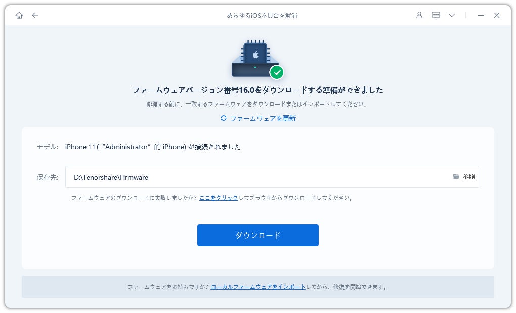 STEP4:iOS16ファームウェアが自動的に検出されますので、確認して問題がなければ「ダウンロード」をクリックします。