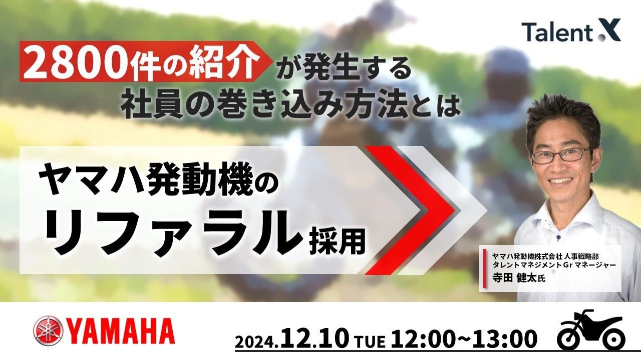 株式会社TalentX(本社:東京都新宿区、代表取締役社長:鈴木貴史)は、ヤマハ発動機株式会社(以下「ヤマハ発動機」)をゲストにお招きして、「2800件の紹介活動が発生する ヤマハ発動機のリファラル採用」をテーマにお話しいただく採用マーケティングセミナーを12月10日(火)に開催いたします。