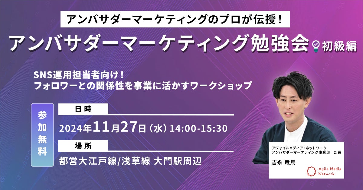 『世界中の“好き”を加速する』をビジョンに掲げ、ブランドのファン育成・活性化を手がけるアジャイルメディア・ネットワーク株式会社(本社:東京都港区、代表取締役社長:寺本直樹、東証グロース上場:証券コード6573、以下AMN)は、このたびセミナー『アンバサダーマーケティング勉強会(初級編)』を開催いたします。