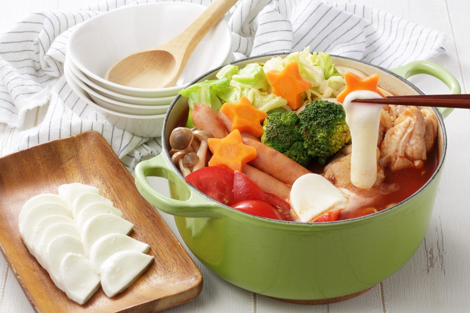 森永乳業の人気商品「クラフト フレッシュモッツァレラ」、カゴメ(株)の人気商品「甘熟トマト鍋スープ」を使用します。