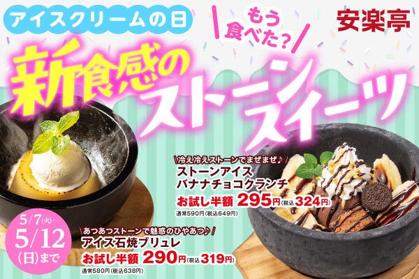 だんだん暑くなるにつれて恋しくなる〝アイスクリーム〟。焼肉レストラン安楽亭では、5月9日の『アイスクリームの日』(日本アイスクリーム協会制定)にちなんで「アイス石焼ブリュレ」と「ストーンアイス バナナチョコクランチ」を特別価格・半額でご提供します。