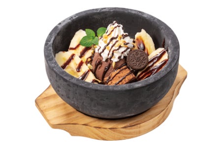 冷え冷えの石焼鍋の「ストーンアイス バナナチョコクランチ」は、チョコアイス、バナナ、クッキーなどを盛り合わせたアイスとフルーツのねっとり食感が楽しめるスイーツです。冷え冷えストーンの中でまぜあわせ、アイスがねっとりしてきたら完成!まぜ方で食感の変化をお楽しみいただけます。