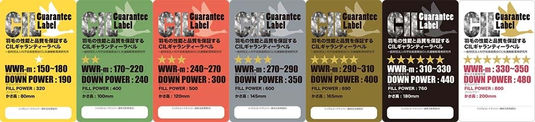 羽毛の品質を検査する専門機関によって、発行されるラベルによって使っている羽毛のランクが分かれています。「タンスのゲン」の羽毛布団では、一般社団法人科学技術振興会の快適睡眠機関研究所が発行する「CILギャランティーラベル」によるランク付けを行っております。