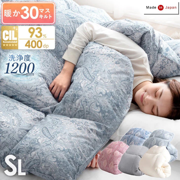 CILシルバーラベルを取得しホワイトダックダウンを90%使用した羽毛布団です。キルト数を30マスにすることで羽毛の偏りをなくし、一般的な20マスの羽毛布団と比べ約1.8倍のフィット性があります。また、こちらも立体キルトで暖気が逃げにくくなっています。