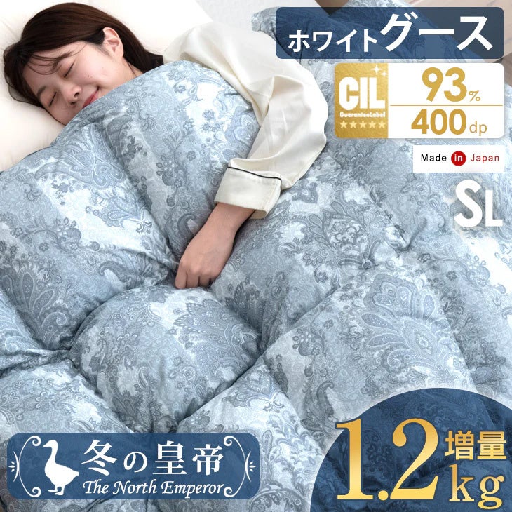 CILゴールドラベルを取得し、匂いが少なく暖かいホワイトグースダウンを93%使用した羽毛布団です。こちらはシングルサイズで1.2kgの充填量がある増量タイプとなっております。また、羽毛の体に触れる中央のキルトと襟・足元の部分のキルトに羽毛を増量することで、冷気が侵入を防ぎ暖かい空気が逃げにくくなっています。