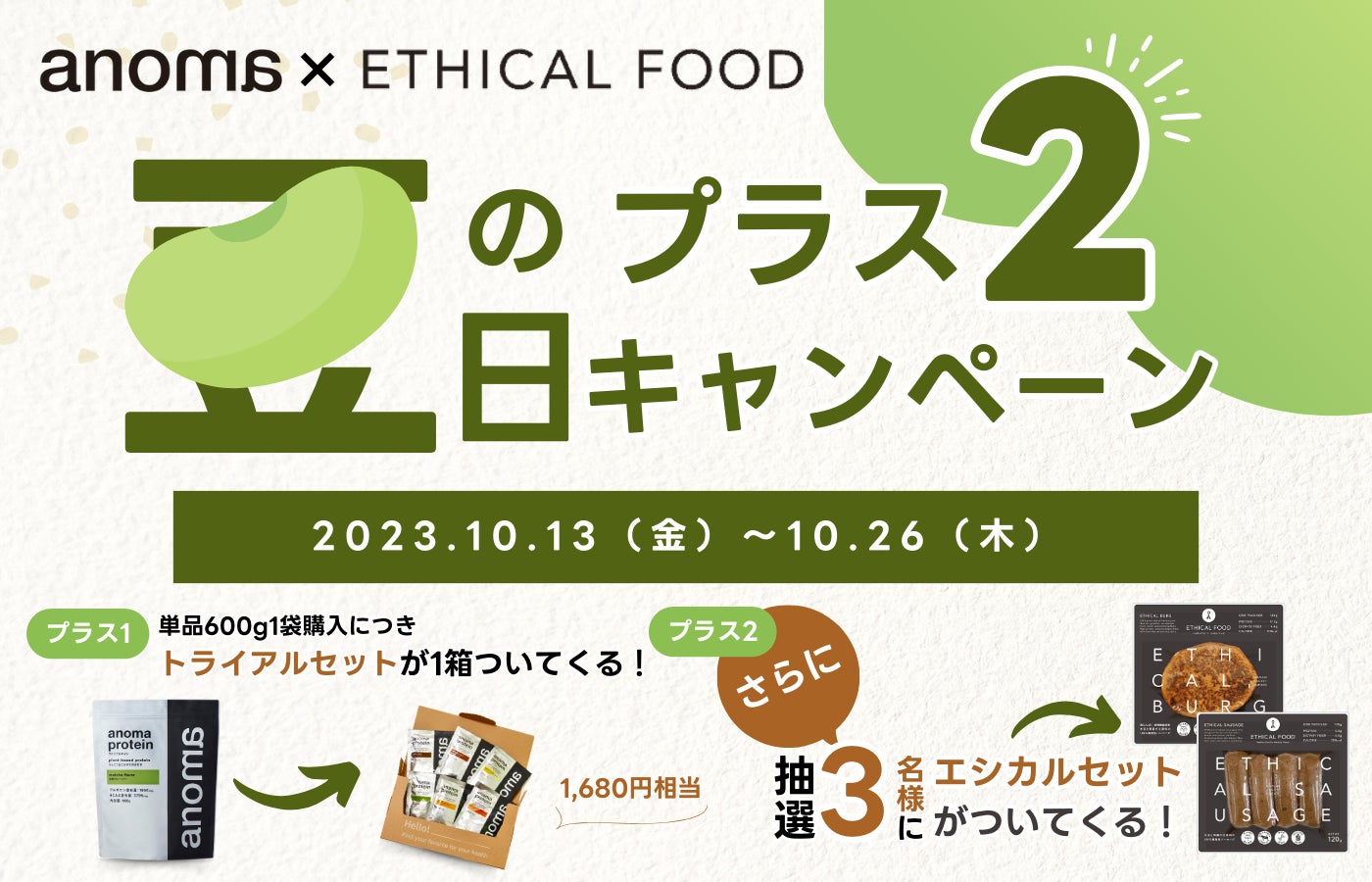 10月13日待望の「豆の日」※に、えんどう豆由来のピープロテインブランドanomaと、大豆や蒟蒻を活用した商品を展開するエシカルフード(エシカルフード株式会社、東京都中央区、CEO &Co-Founder渡我部 一成 氏)の、コラボキャンペーンを実施いたします。