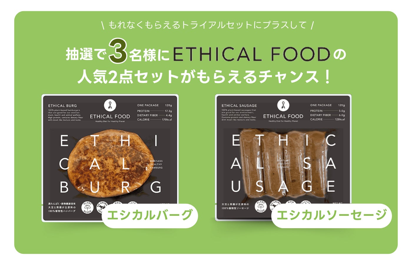 キャンペーンに応募された方の内、抽選で3名様に100%植物性のエシカルバーグとエシカルソーセージをプレゼント!