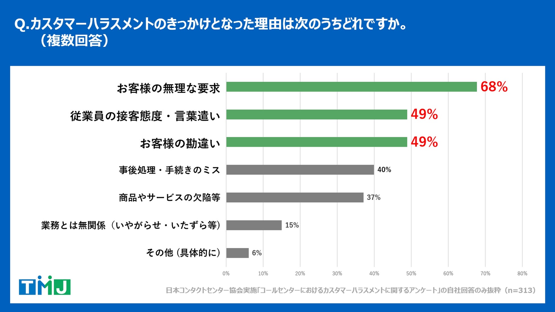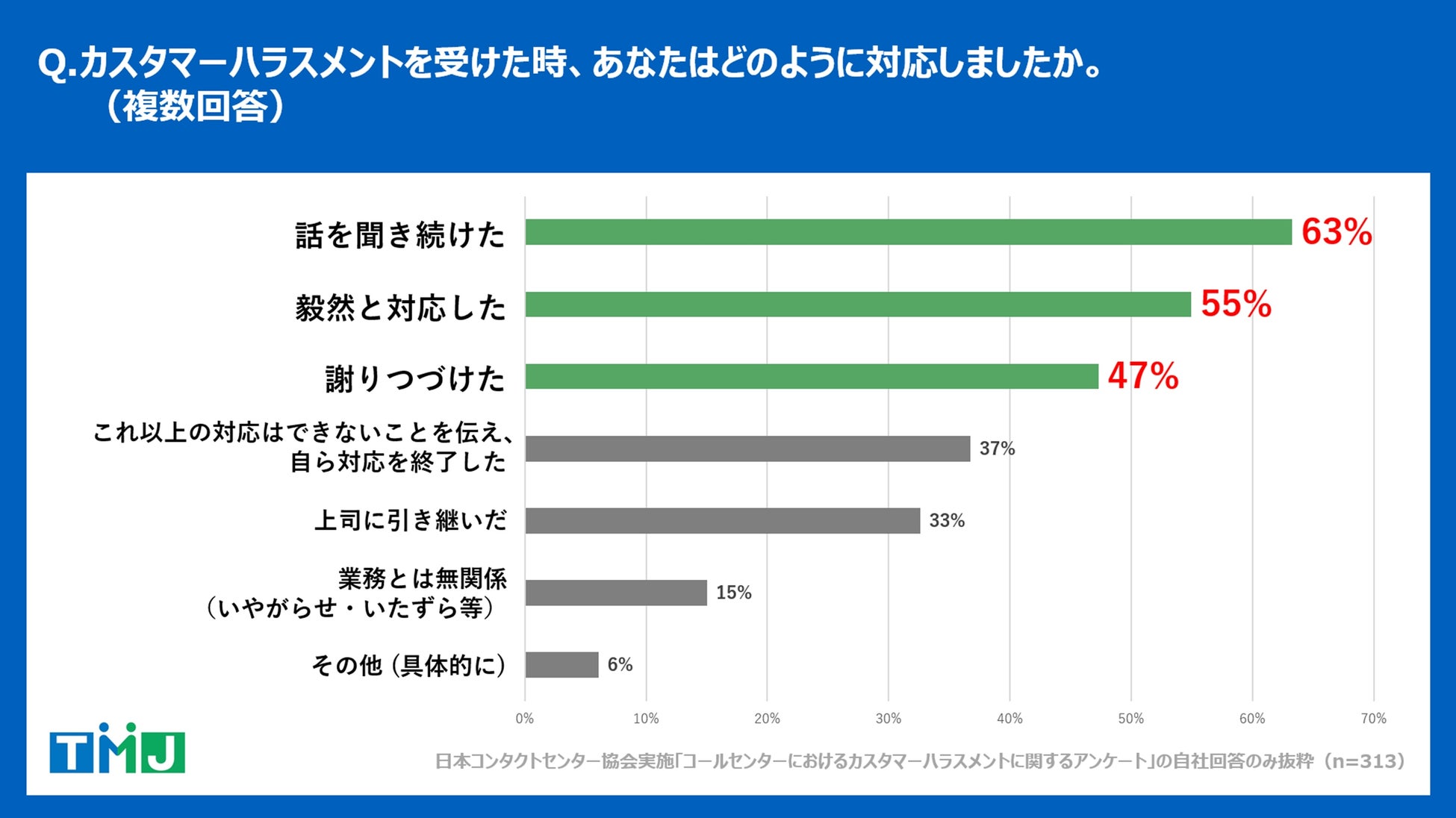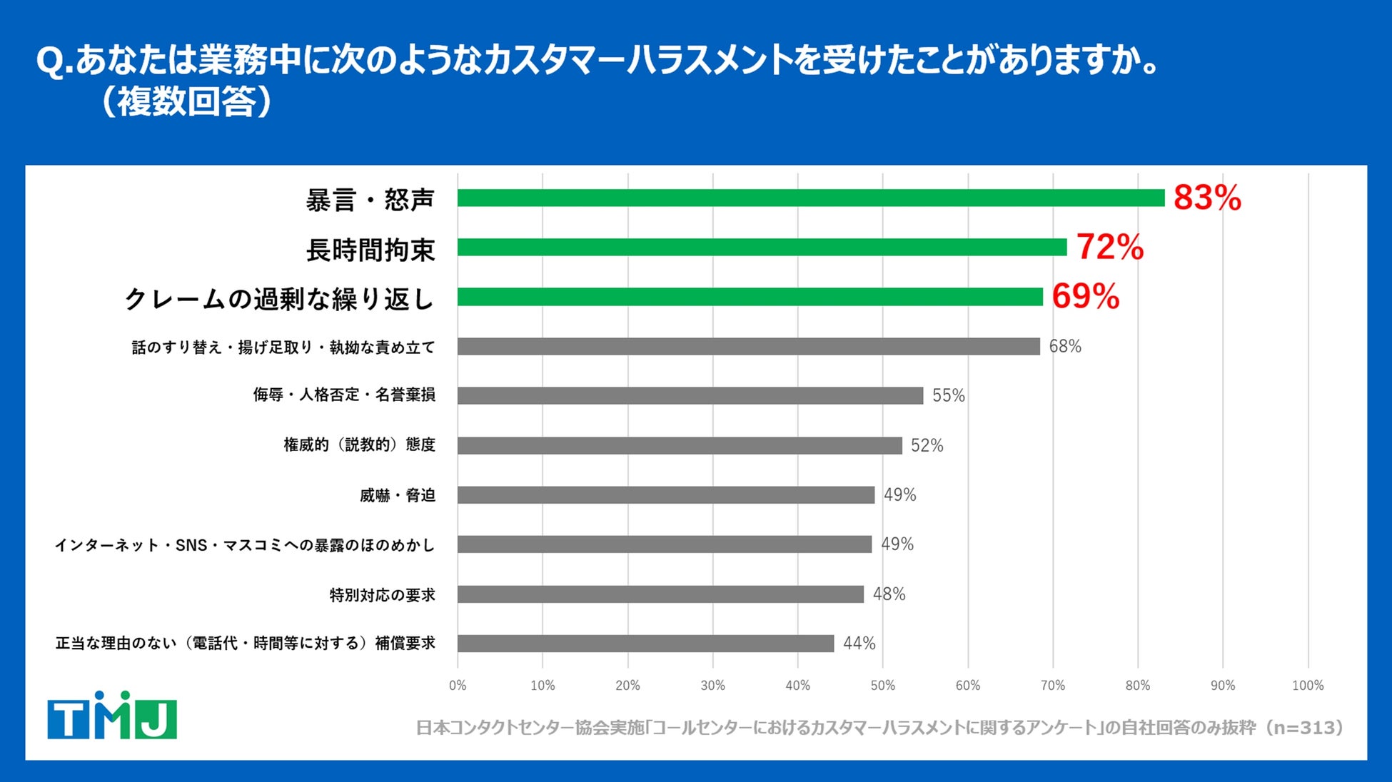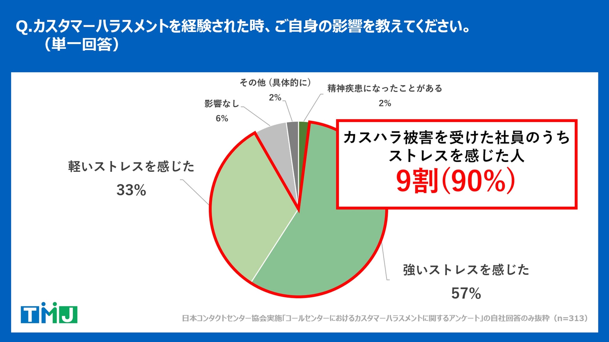 コールセンター・バックオフィス(事務処理センター)の構築・運営を行うセコムグループの株式会社TMJ(本社:東京都新宿区、代表取締役社長執行役員:丸山 英毅、以下TMJ)は、自社のコンタクトセンターに勤める従業員313名を対象に調査を実施し、「カスタマーハラスメントの現状と対策に関する調査レポート」を公開しましたので、お知らせいたします。