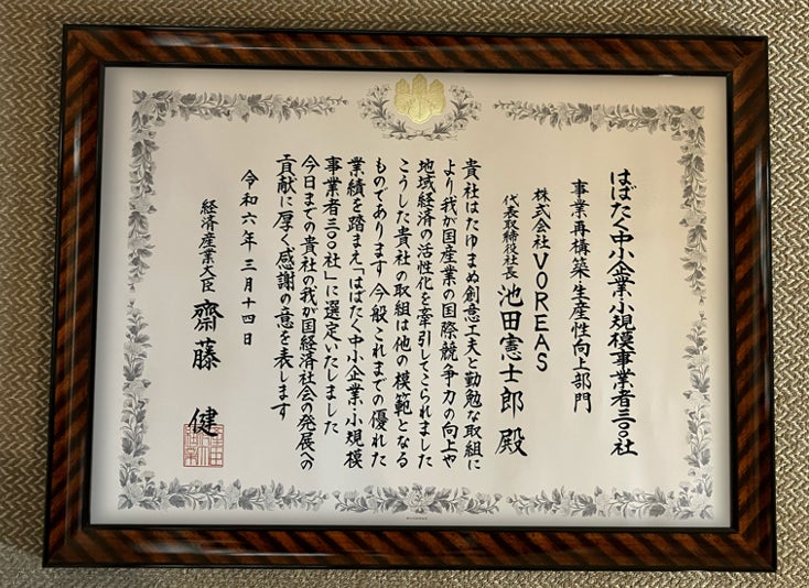 「はばたく中小企業・小規模事業者300社」は、経済社会構造の変化に対応して事業変革や新規事業に挑戦し、地域経済や日本経済の成長への貢献が期待できるモデルとなる中小企業を経済産業省中小企業庁が選定、表彰する制度です。「事業再構築・生産性向上」「海外展開」「GX・DX」「人への投資・環境整備」の4部門うち、VOREASは「事業再構築・生産性向上」部門で選ばれました。