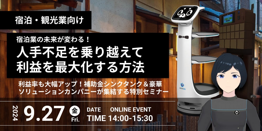 宿泊業界では、労働力不足や物価高、国が推進するインバウンド対策を背景に、利益率の向上と省力化が重要な課題となっています。本セミナーでは、これらの課題を解決するための人手不足対策設備の導入と、それに関連する設備系補助金の具体的な活用方法をご紹介します。 株式会社補助金ポータル(本社:東京都渋谷区、代表取締役:福井彰次)は、AVITA株式会社(本社:東京都品川区、代表取締役CEO:石黒浩)、株式会社 DFA Robotics(本社:東京都渋谷区、代表取締役社長:松林大悟)、Keeyls株式会社(本社:東京都港区、代表取締役CEO 大貫功二)が共催で、「宿泊業の未来が変わる!人手不足を乗り越えて利益を最大化する方法」をテーマにした無料オンラインセミナーを2024年9月27日(金)14時~15時30分に開催いたします。Zoomでどなたでもお気軽にご視聴いただけますので、ぜひご参加ください。