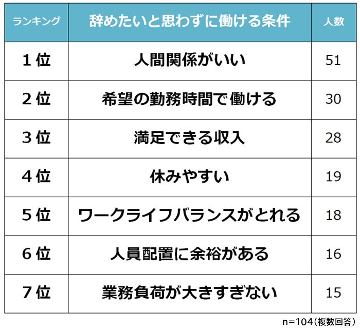 1位になったのは「人間関係がいい(51人)」です。 2位「希望の勤務時間で働ける(30人)」、3位「満足できる収入(28人)」、4位「休みやすい(19人)」と続きます。