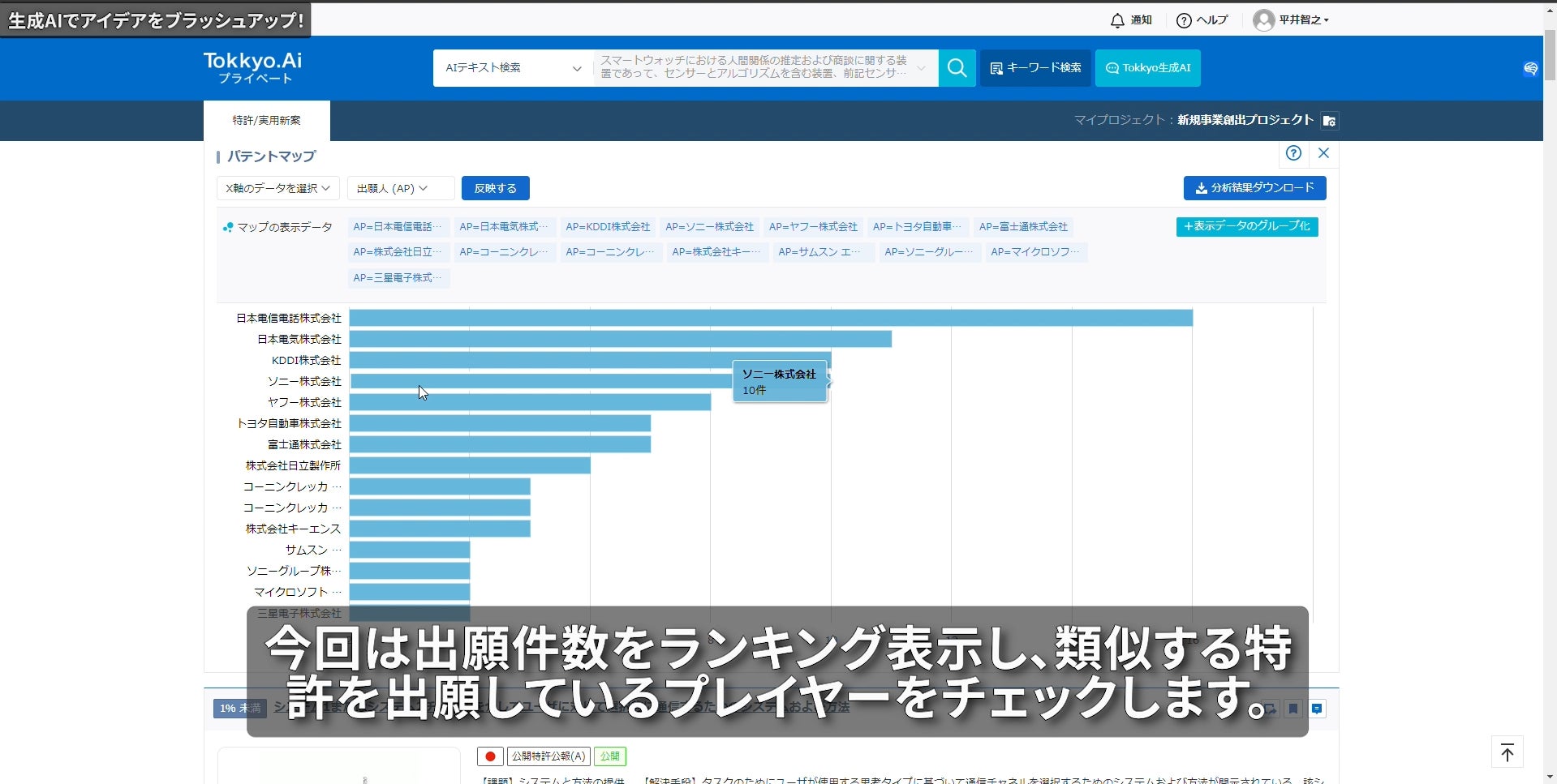 従来の特許検索・分析機能に加え、生成AIの機能を追加したことにより、特許文案の生成後すぐ、AIによる類似特許の検索を行うことができ、さらには特許件数のランキング表示といった分析も行うことができる。