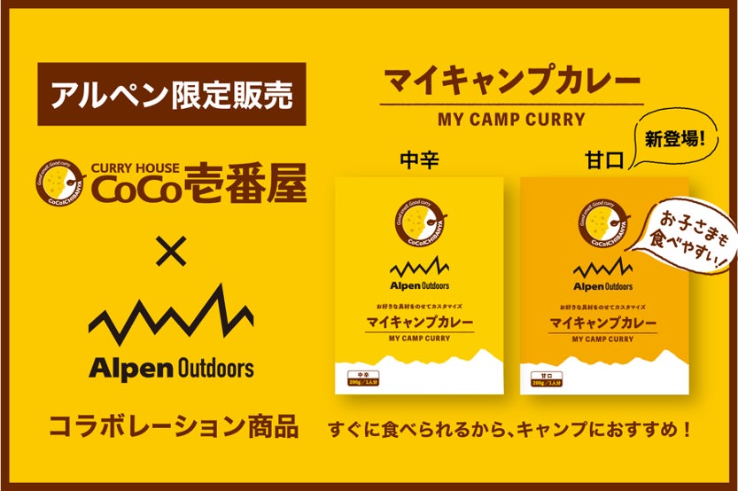 最大のカレー専門チェーン店の『カレーハウスCoCo壱番屋』とコラボレーション。『カレーハウスCoCo壱番屋』のカレーに対する知識と情熱に、『アルペンアウトドアーズ』のキャンプに対する知識と情熱を掛け合わせることで「キャンプ用カレー」を開発いたしました。