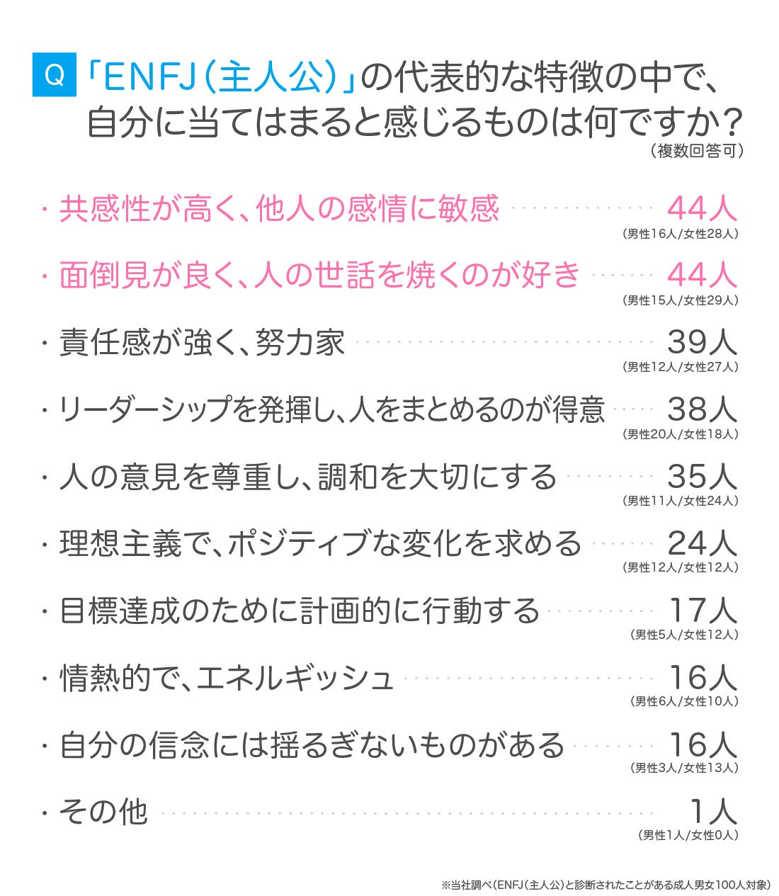 調査対象:MBTIテストを受けたことがある成人男性・成人女性、MBTIテストで「ENFJ」と診断された成人男性・成人女性、MBTIテストで「ENFJ」と診断されたことがない成人男性・成人女性