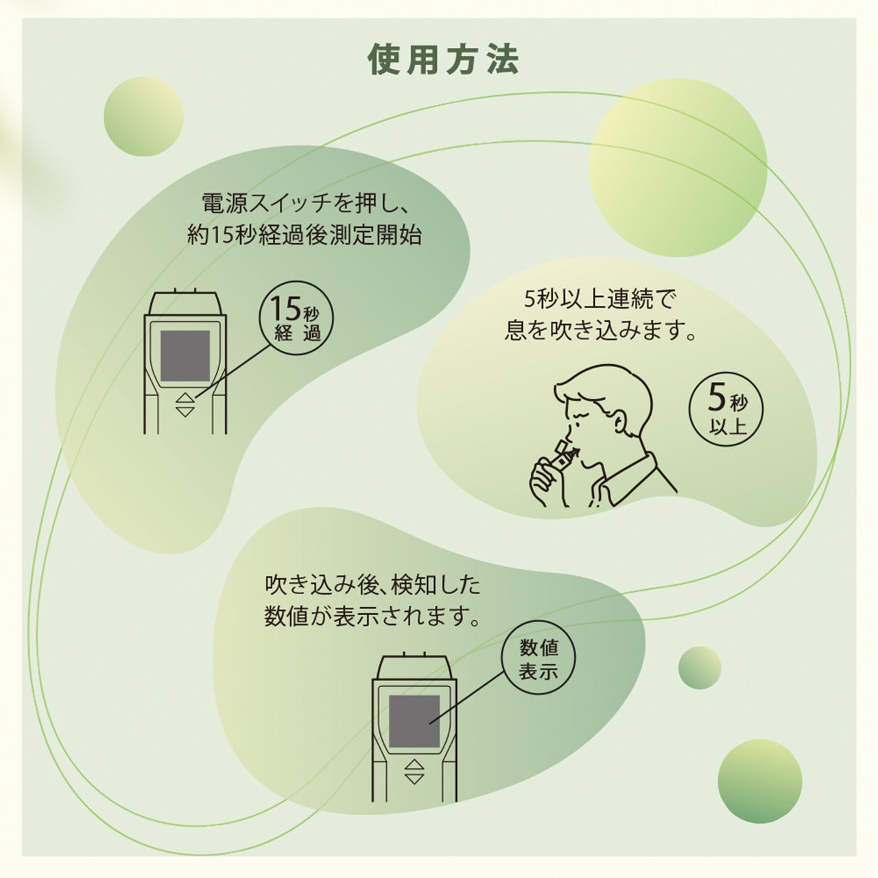 本体は手の平に収まるコンパクトサイズで、乾電池(単4形)×2本で使用。息を吹き込むだけのカンタン操作でアルコールチェックが可能です