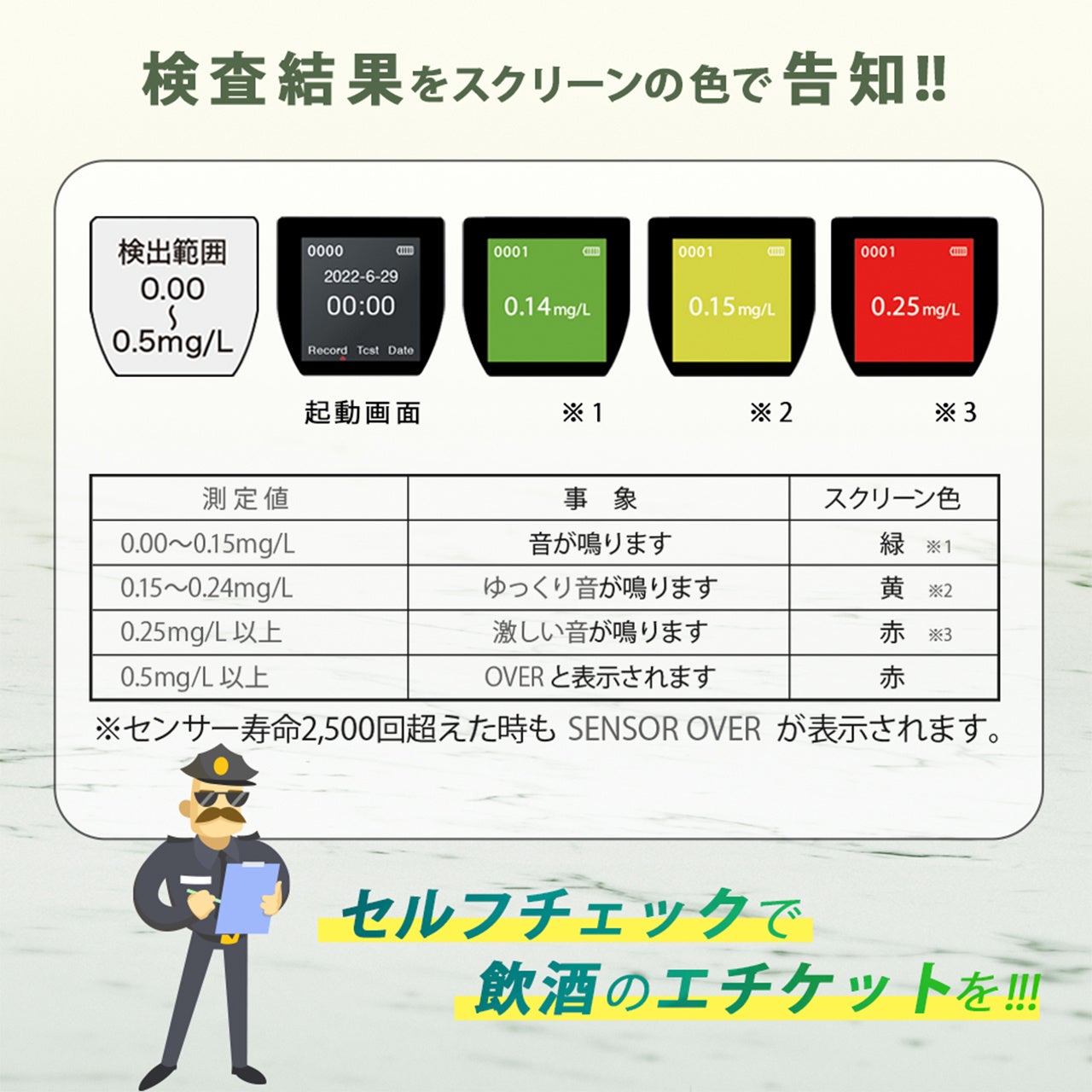 【0.25mg/L以上】クリーン赤/激しい音が鳴る【0.5mg/L以上】スクリーン赤/OVERと表示される
