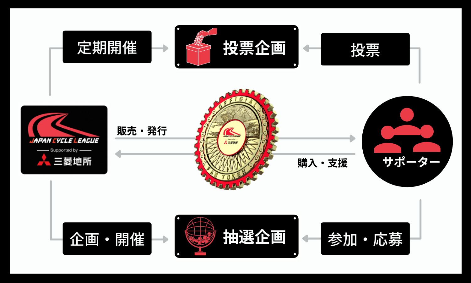今回、チームを統括するジャパンサイクルリーグがトークンを発行することで、新たなファンコミュニティを創出し、リーグの発展・拡大を目指します。また、日本ロードレース界発展のため、プロ選手、プロ的興行を作り上げ、世界へ挑戦しうる環境を作り上げていきます!