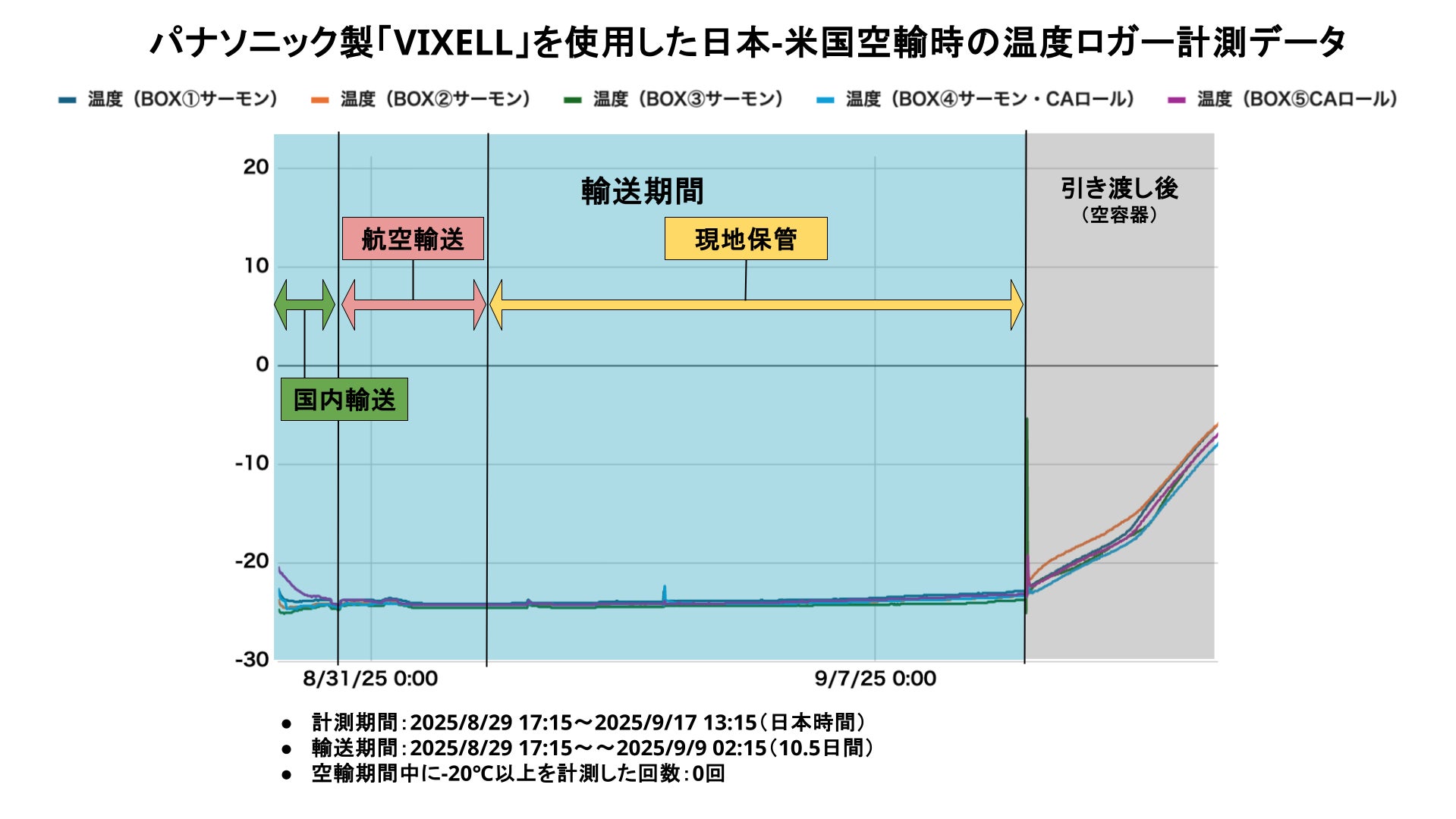 今回の検証は、2025年8月29日に日本を出発した冷凍寿司を対象に行いました。9月9日に米国現地で受け取るまでの約10日間、輸送した5つの「VIXELL」ボックスすべてがマイナス22℃以下を維持していたことを、同梱した温度ロガーデータにより確認。この結果、空輸においても冷凍寿司の品質維持に十分なコールドチェーンを維持できることが証明されました。