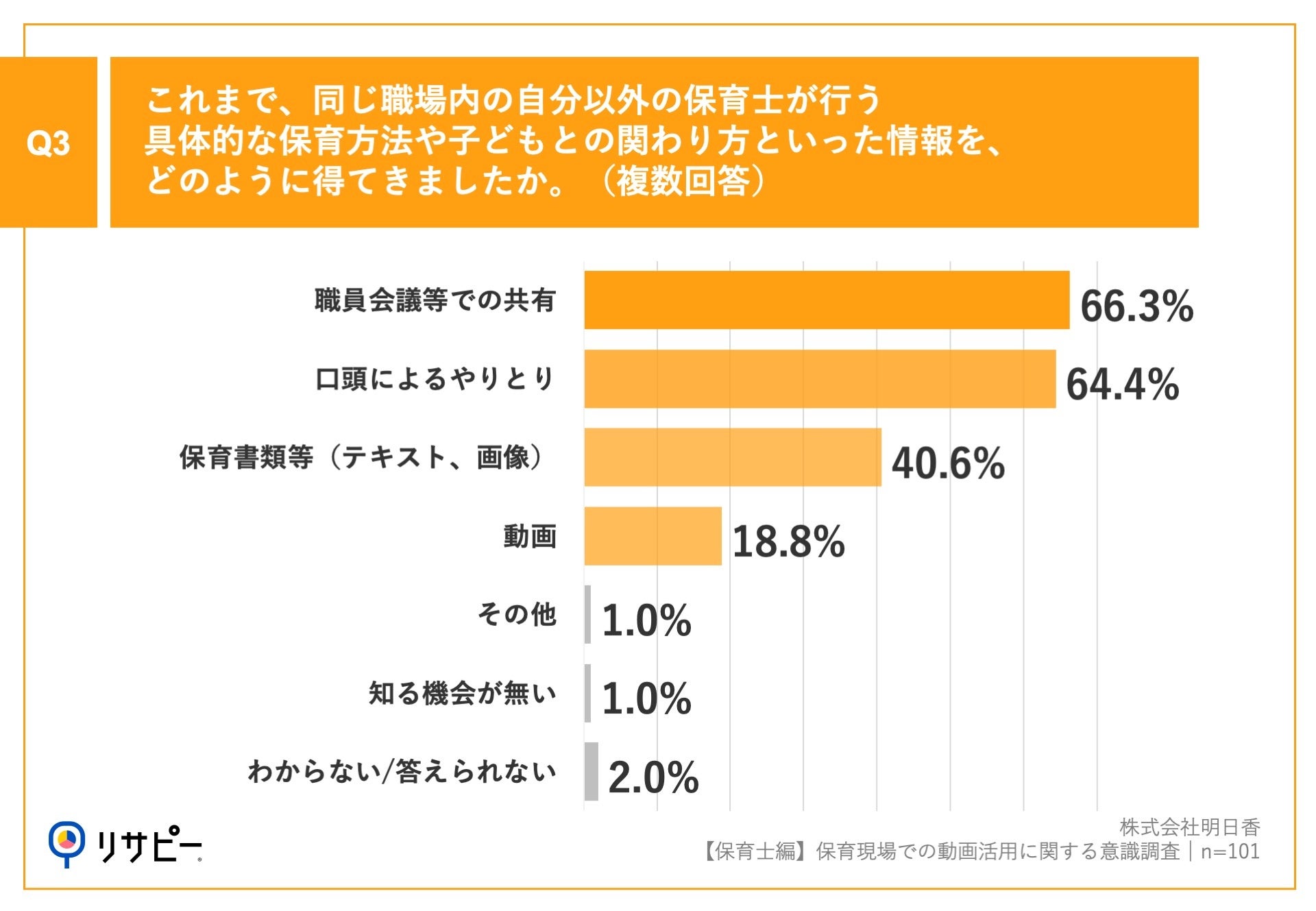 Q2で「非常に興味がある」「やや興味がある」に回答した方に、「Q3.これまで、同じ職場内の自分以外の保育士が行う具体的な保育方法や子どもとの関わり方といった情報を、どのように得てきましたか。(複数回答)」(n=101)と質問したところ、「職員会議等での共有」が66.3%、「口頭によるやりとり」が64.4%、「保育書類等(テキスト、画像)」が40.6%という回答となりました。