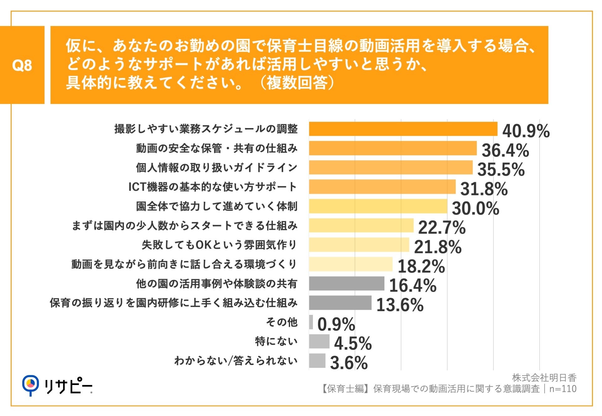 「Q8.仮に、あなたのお勤めの園で保育士目線の動画活用を導入する場合、どのようなサポートがあれば活用しやすいと思うか、具体的に教えてください。(複数回答)」(n=110)と質問したところ、「撮影しやすい業務スケジュールの調整」が40.9%、「動画の安全な保管・共有の仕組み」が36.4%、「個人情報の取り扱いガイドライン」が35.5%という回答となりました。