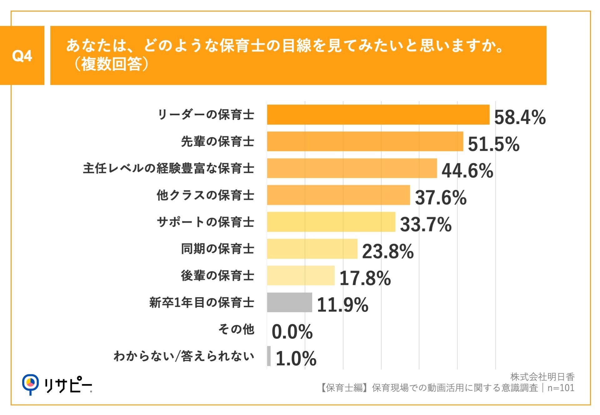 Q2で「非常に興味がある」「やや興味がある」と回答した方に、「Q4.あなたは、どのような保育士の目線を見てみたいと思いますか。(複数回答)」(n=101)と質問したところ、「リーダーの保育士」が58.4%、「先輩の保育士」が51.5%、「主任レベルの経験豊富な保育士」が44.6%という回答となりました。