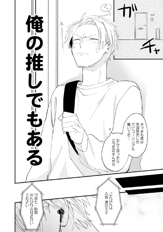 大学生の大神飛鳥は、周りに内緒で人気男性声優の吉野鷹臣を激推し中。