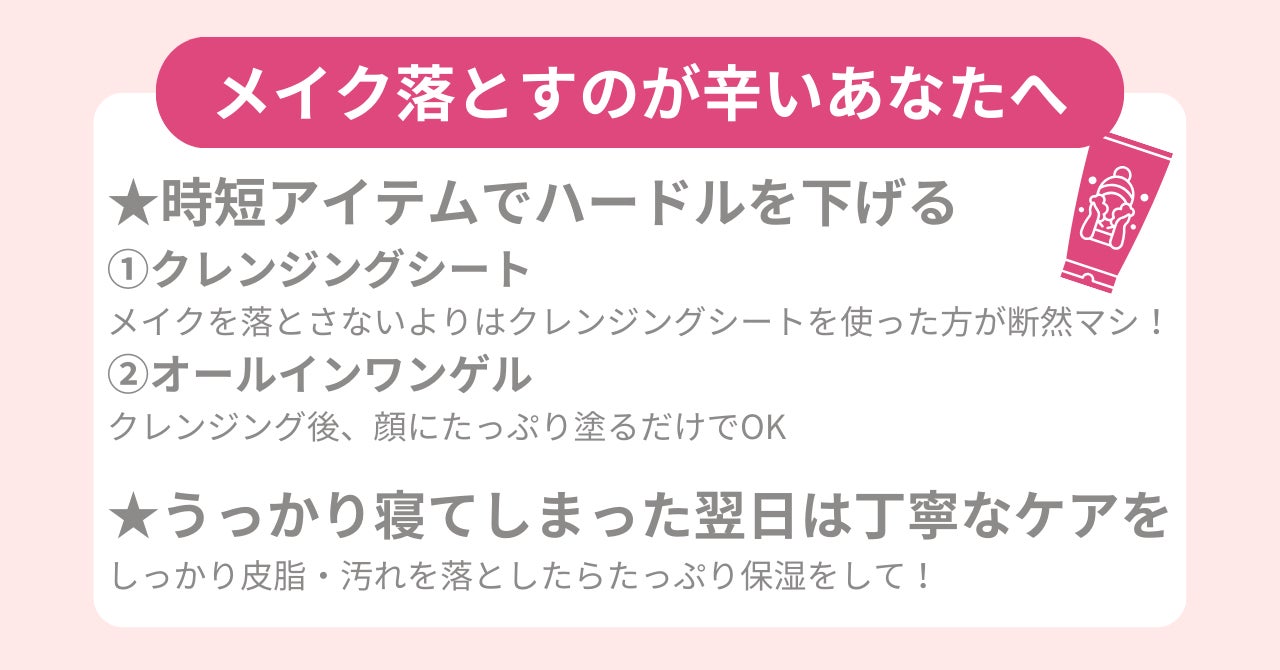 以下で、メイクを落とさずに寝て、肌荒れしてしまうのを防ぐポイントを紹介します。