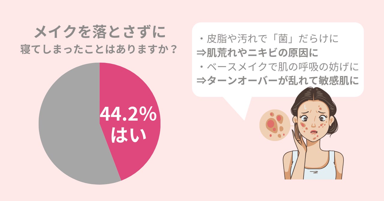 株式会社アースケアは20〜30歳の女性100名に「メイク落とし」に関する調査を行いました。<調査結果>44.2%の女性がメイクを落とさずに寝てしまったことがある