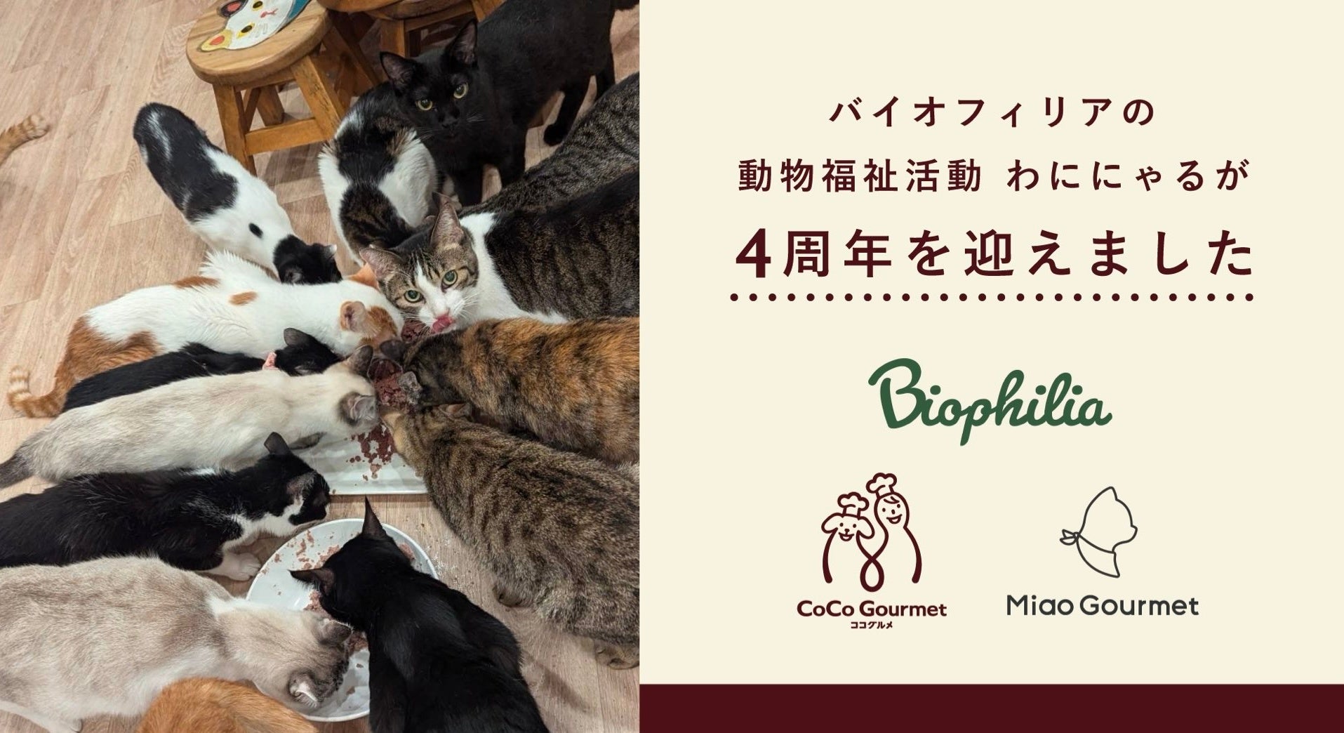 ワンちゃん用手作りごはんブランド「CoCo Gourmet(以下:ココグルメ)」、猫ちゃん用手作りごはんブランド「Miao Gourmet(以下:ミャオグルメ)」などを展開する株式会社バイオフィリア(本社:東京都新宿区、代表:岩橋洸太、以下:当社)が取り組む動物福祉活動「わににゃる」が4周年を迎えました。