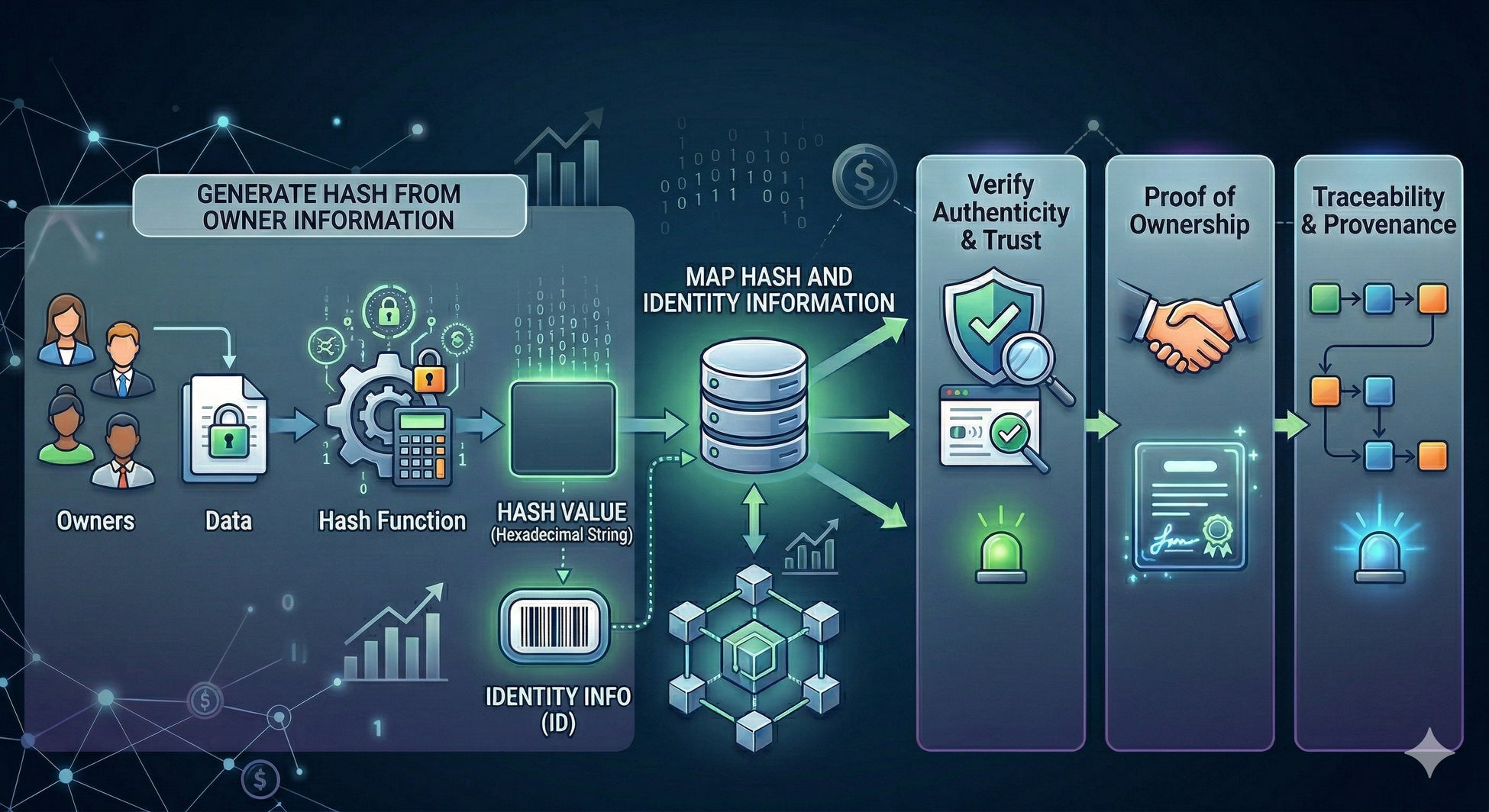 本特許の元となる出願は、所有者情報から生成されるハッシュ値と識別情報を対応付け、真正性(トラスト)確認、所有者証明、来歴追跡を行う構成を示しています。金融実務の言葉に置き換えれば、送金先アドレスだけを見るのではなく、その支払いが何に対するものか、誰の所有権と整合するのか、どの履歴に基づくのかまで確認してから動かすということです。