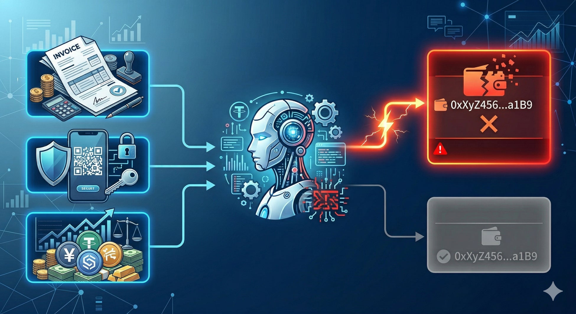 「AIエージェント」が請求書データを読み取り、ステーブルコインで支払いを実行する場面を考えます。請求先ウォレットの読み取り、支払条件、その他送金先指定等々の作業がある中で、どこかで一つでも取り違えが起きれば、そのまま誤送金が走ります。