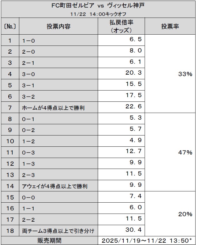 ※1 11月21日(金)10時時点の投票状況となります。払戻倍率(オッズ)は、投票状況により販売終了まで変動します。払戻倍率(オッズ)は、スポーツくじオフィシャルサイト(https://www.toto-dream.com/)で随時更新しています。