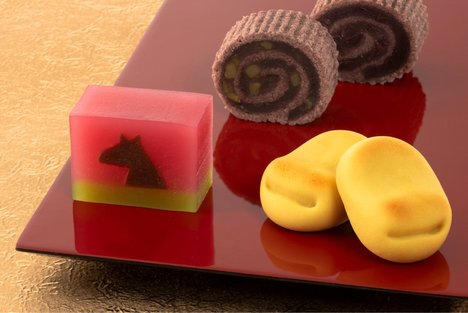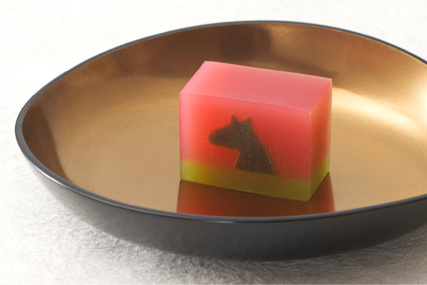 備中白小豆と手亡豆を主とした上品な甘さの二層羊羹に、黒糖風味をしのばせた馬の意匠が。どこを切っても同じ図柄が続く縁起菓子、お好みの大きさに切り分けてお召し上がりください。