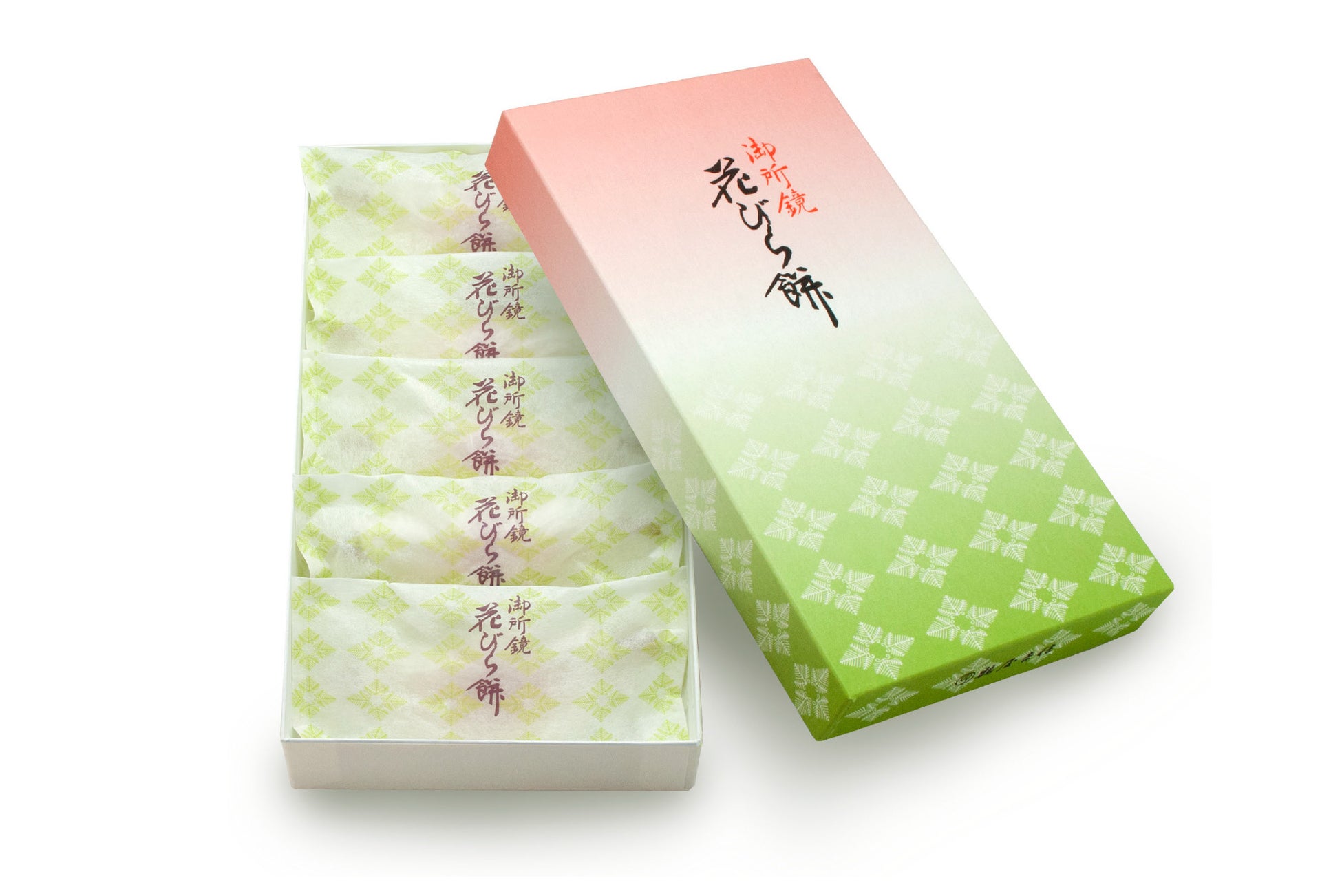 おひとつずつを取扱いやすい個包装の袋にくるみ、専用箱入りに仕上げました。お正月らしい晴れやかな色合いに縁起の良い松菱(まつびし)の文様をあしらった、おめでたい意匠となっております。