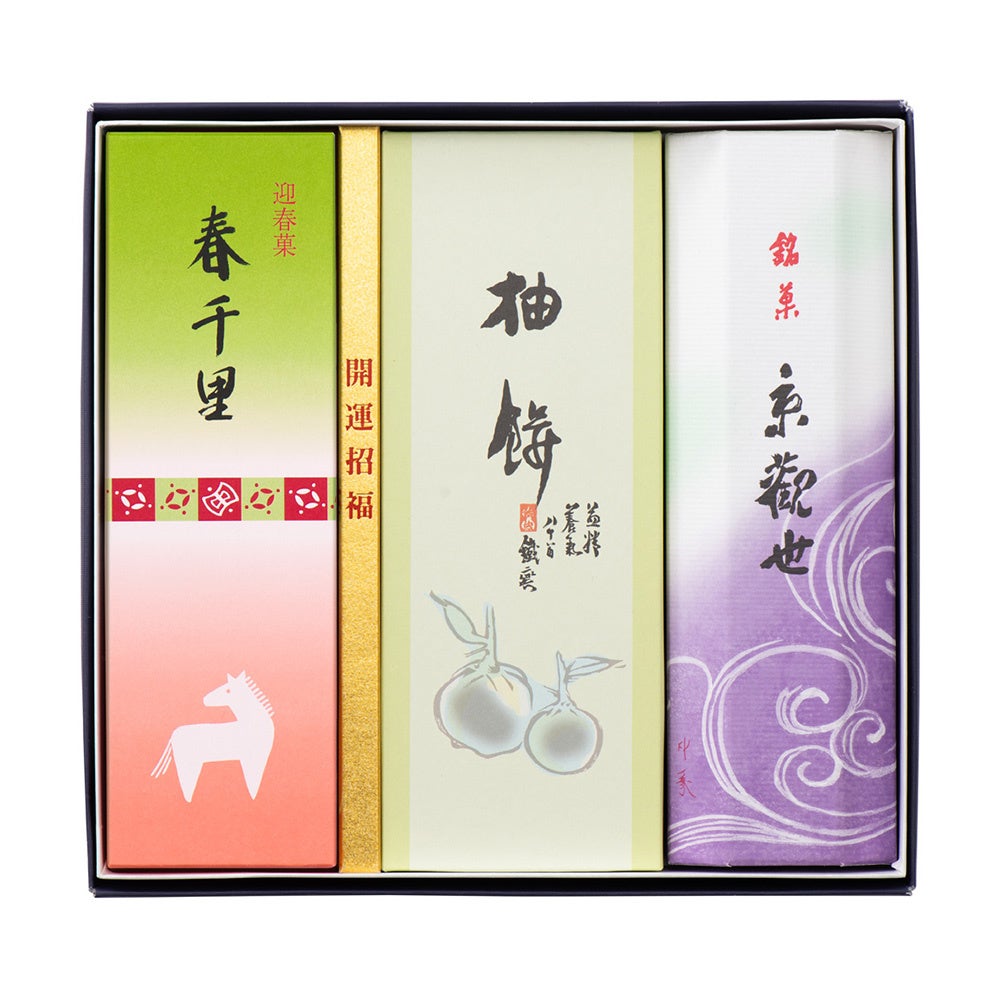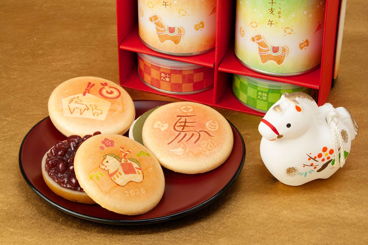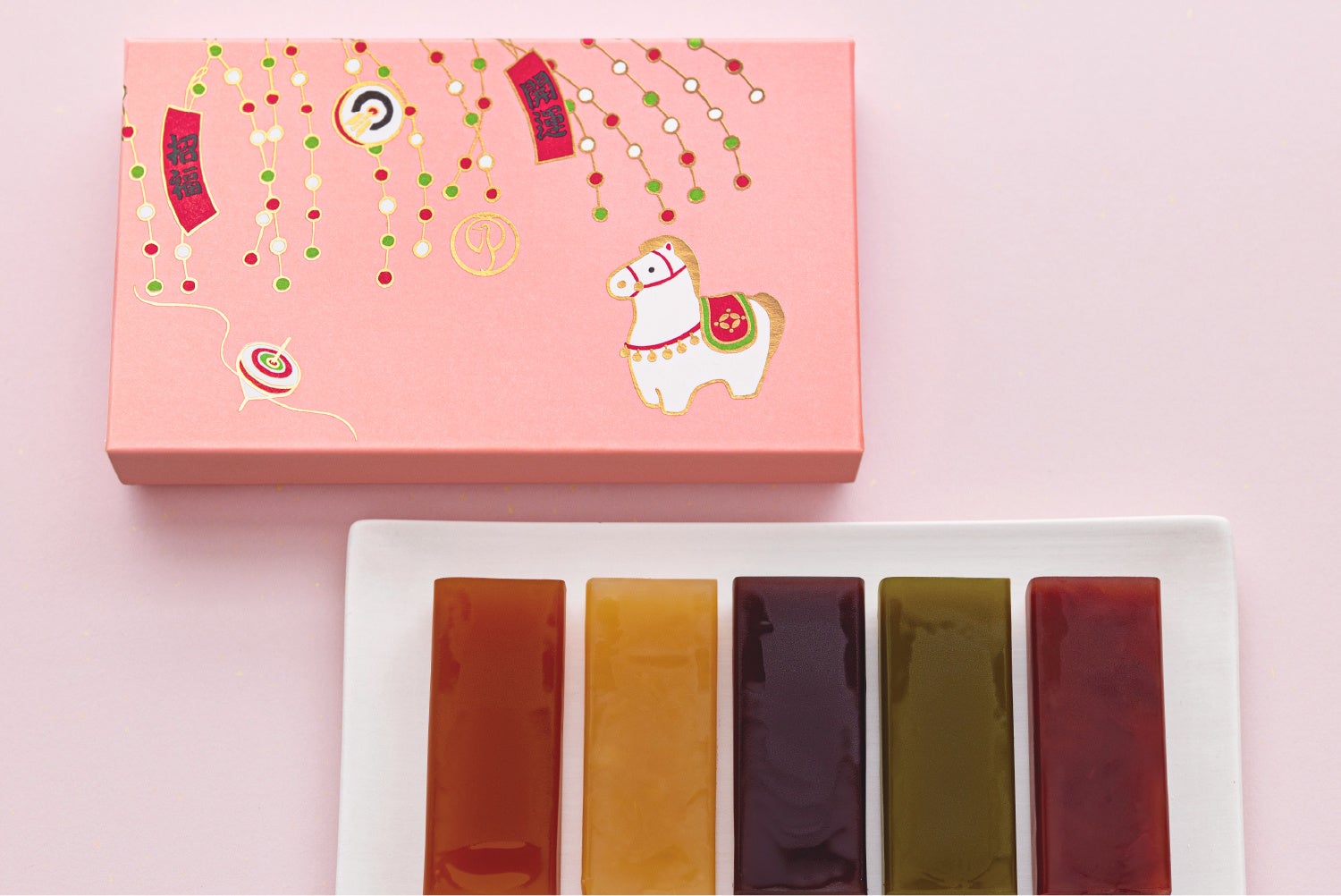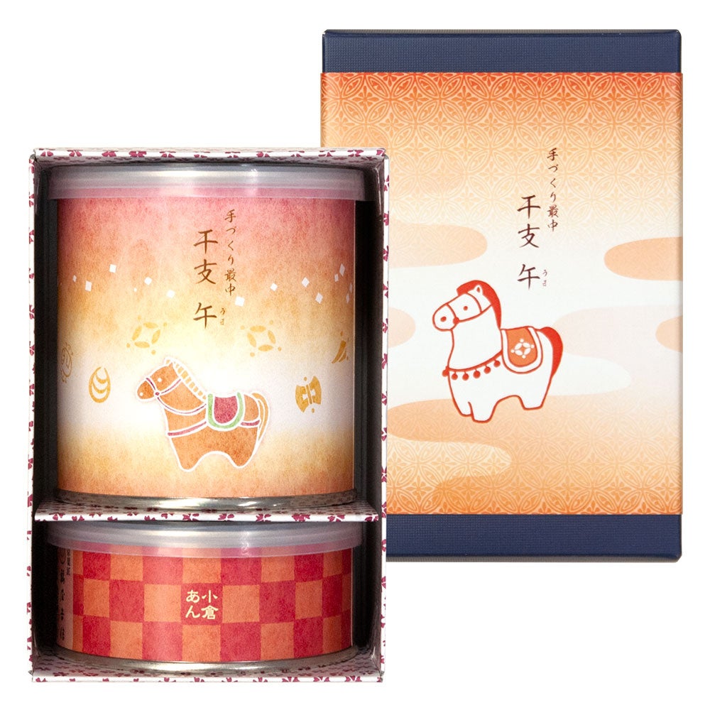 素材から厳選した人気のミニ羊羹5種(小倉・抹茶・黒糖・白小豆・キャラメル)を、「午」デザインをあしらった新春限定のBOXに詰め合わせました。