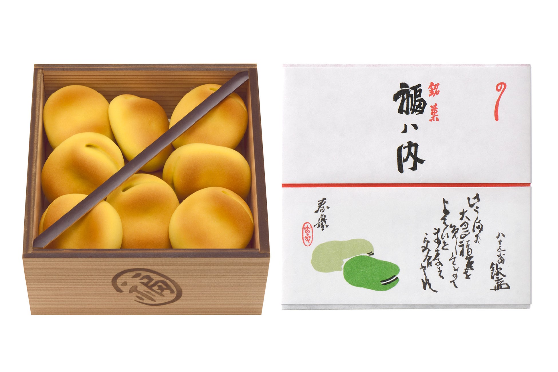 福を招く「お多福豆」になぞらえた、ふっくら桃山製の焼き菓子。明治37年の創案以来、鶴屋吉信の冬を代表する銘菓として120年以上もの間ご愛顧いただいております。元々は節分の豆まきから発想を得た「福ハ内」。特製の木箱は「桝(ます)」の形を模し、「ますます」繁盛しますようにとの願いをこめました。