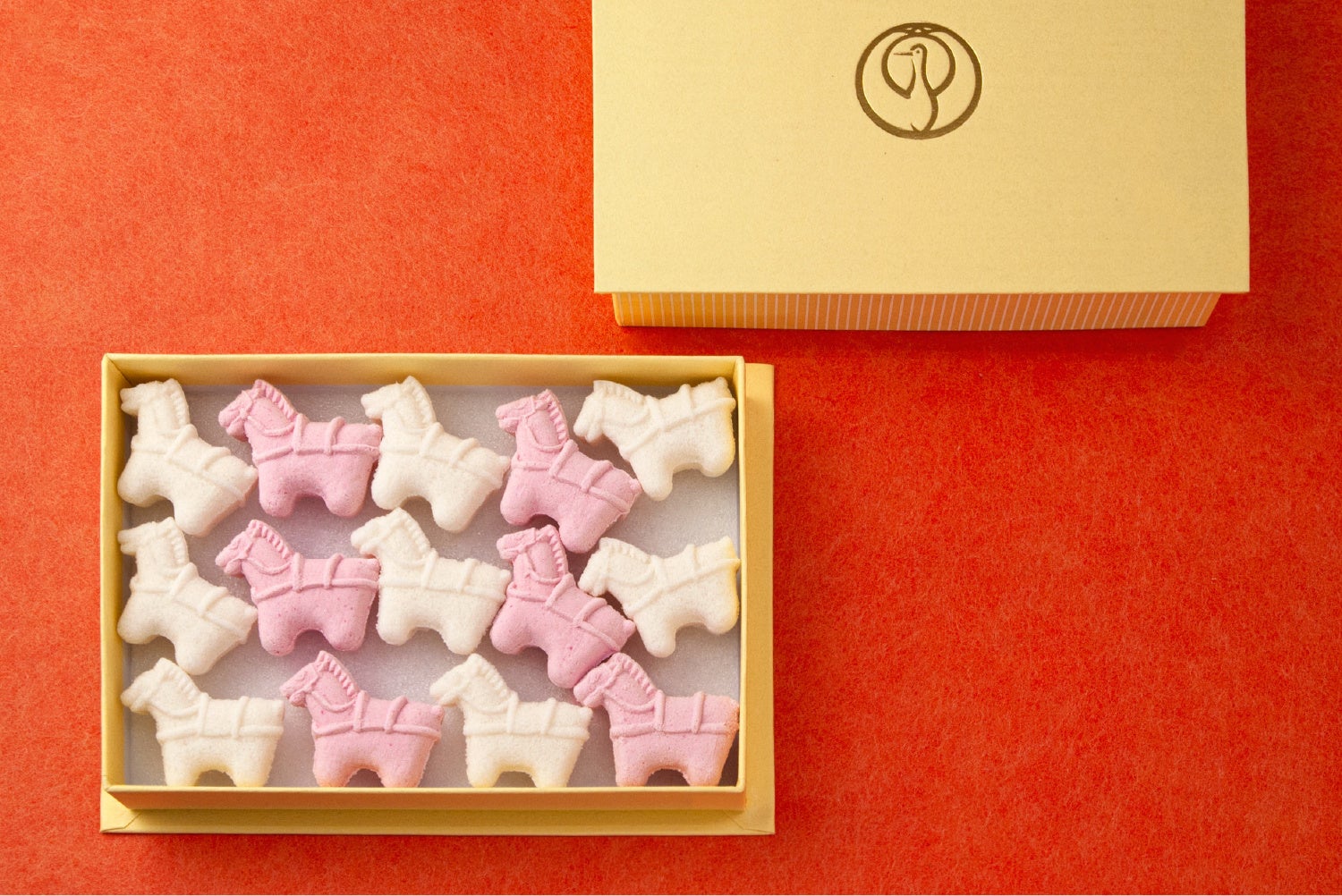 新年を祝う伝統のお干菓子詰合せです。馬具をつけた凛々しい馬の立ち姿を、白の落雁・ピンクの和三盆入り落雁であらわしました。お口の中ですうっと溶ける繊細な味わい、上質でやわらかな甘味。定番のお抹茶、あたたかい日本茶のほか、コーヒーなどにもよく合います。 新年のお茶席をはじめ、日々のお茶のおともにもどうぞ。
