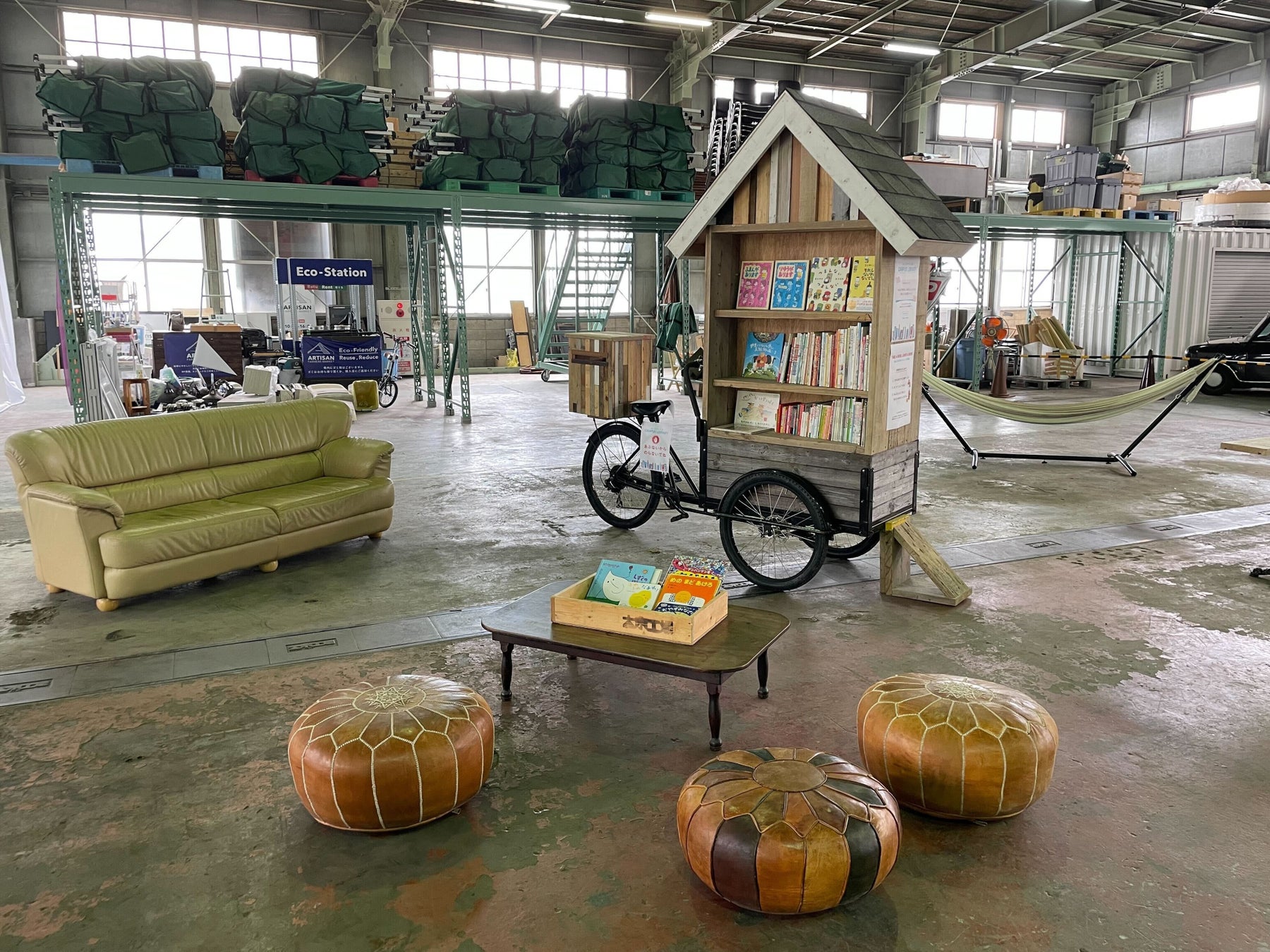 図書館ワゴンは廃材・廃棄自転車を活用し、アップサイクルで制作いたしました。小さいお子さんから大人まで、好きな時に自由に楽しめる「本と人との交流スペース」です。