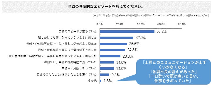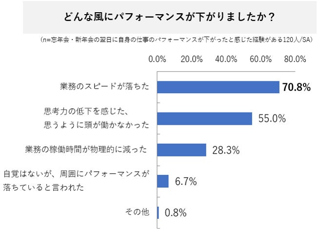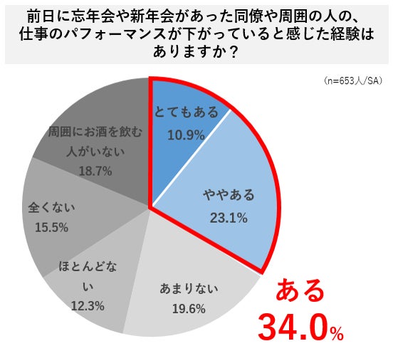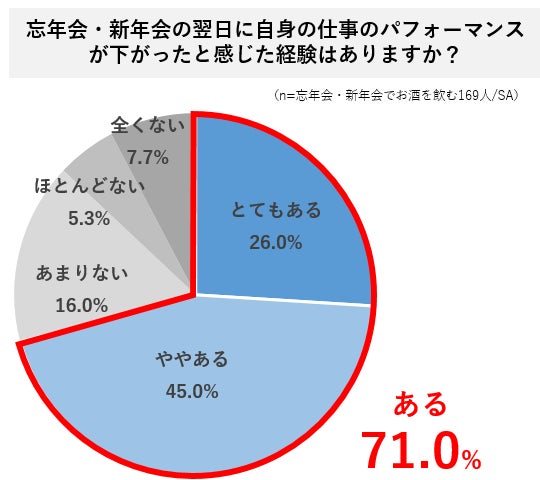 ・飲み会の翌日に仕事のパフォーマンスが下がったと感じた経験がある人は7割以上。また前日に忘年会や新年会